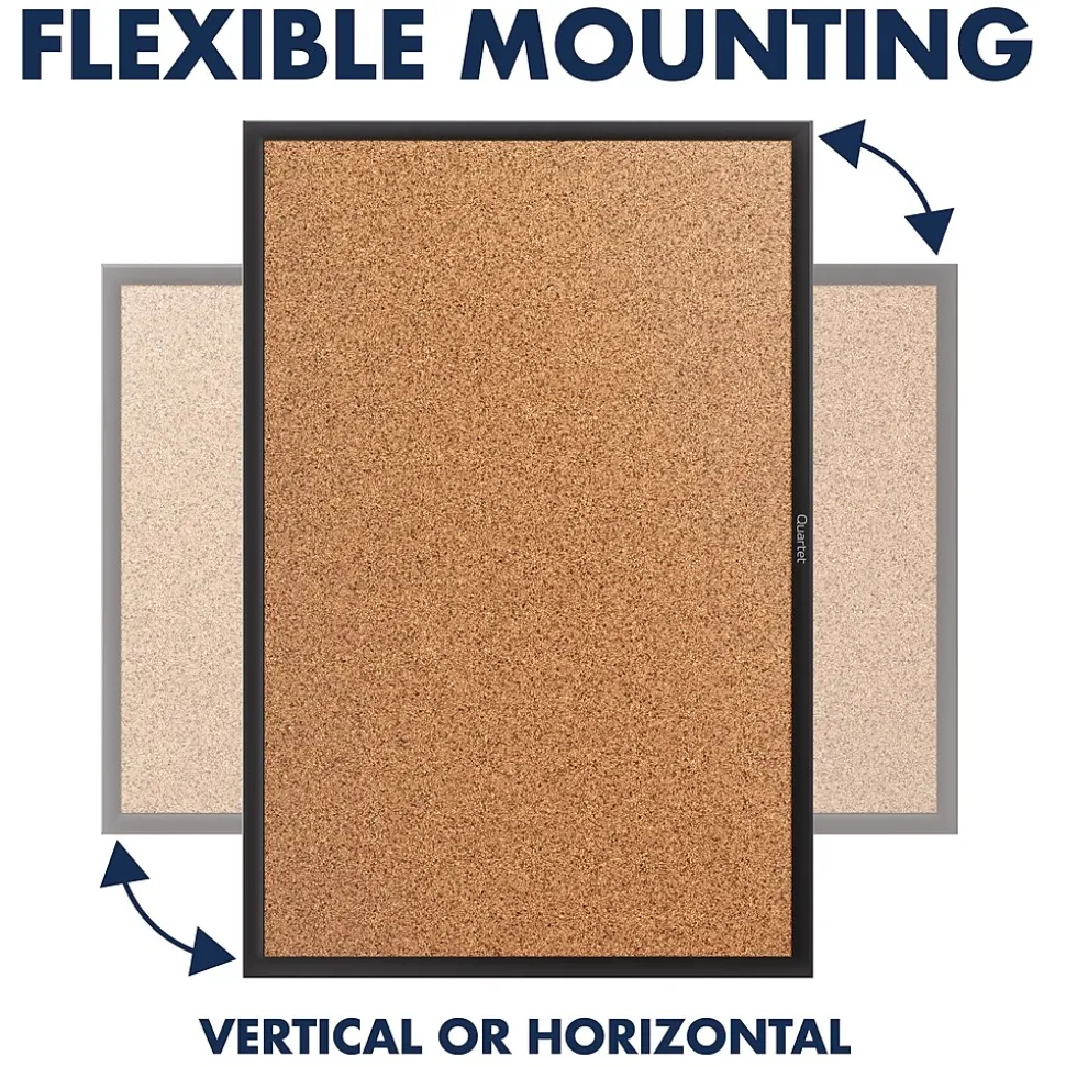 Outfit your office, cubicle or break room with this Quartet cork bulletin board. Self-healing cork provides long-lasting durability, while the black-finish aluminum frame adds a professional touch. The included mounting hardware allows for fast, easy installation. With a durable backing, this Quartet cork bulletin board holds pins securely so your notes and memos stay neatly in place.