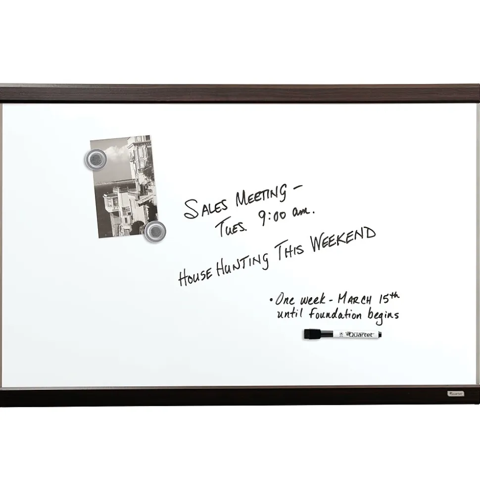 Quartet Magnetic dry-erase board with mahogany finish and aluminum frame measures 2′ x 3′ and is ideal for home office, cubicles or small spaces. Whiteboard quickly secures documents with the included quick clips.