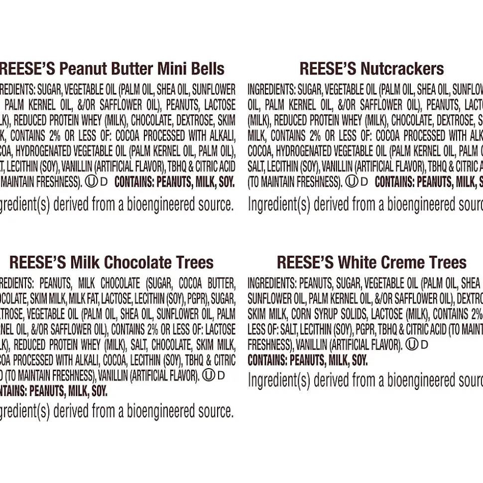 - Includes REESE’S milk chocolate peanut butter trees candy, REESE’S white creme peanut butter trees candy, REESE’S chocolate peanut butter nutcrackers candy and REESE’S chocolate peanut butter mini bells candy