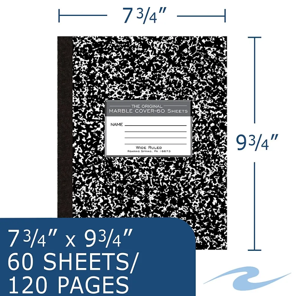 Record your notes in this black marble composition book. The flexible cover makes it easy to store this composition book in a backpack, while the sturdy backing provides a solid writing surface. This Roaring Spring Paper Products composition book has 60 sheets of 15 lb. paper and features a center-sewn, tape bound construction, so you don’t have to keep track of loose pages.