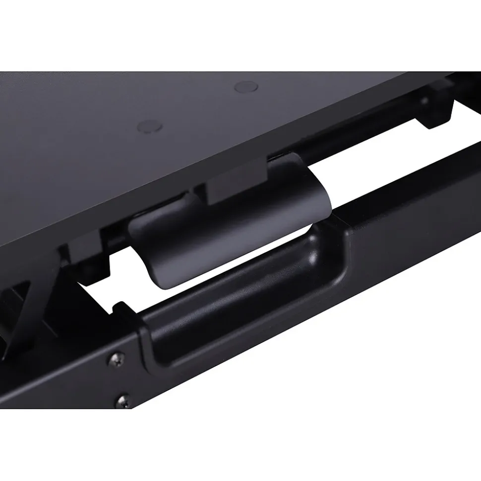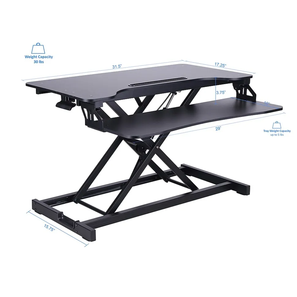 The R VADRB standing desk riser now optimizes your ergonomic work position with even greater Enhanced Vertical Range, which seamlessly raises your tabletop up to 19.7″ and lowers it down to 4.3″. The large 31.5″ x 16.4″ desktop can hold up to two screens along with other small accessories. Its full size 29″ x 10″ removable keyboard tray holds a laptop or keyboard as well as a mouse. This sturdy adjustable workstation arrives fully assembled with nonskid pads to protect your desk from scratches. The black laminated finish will complement any color scheme.