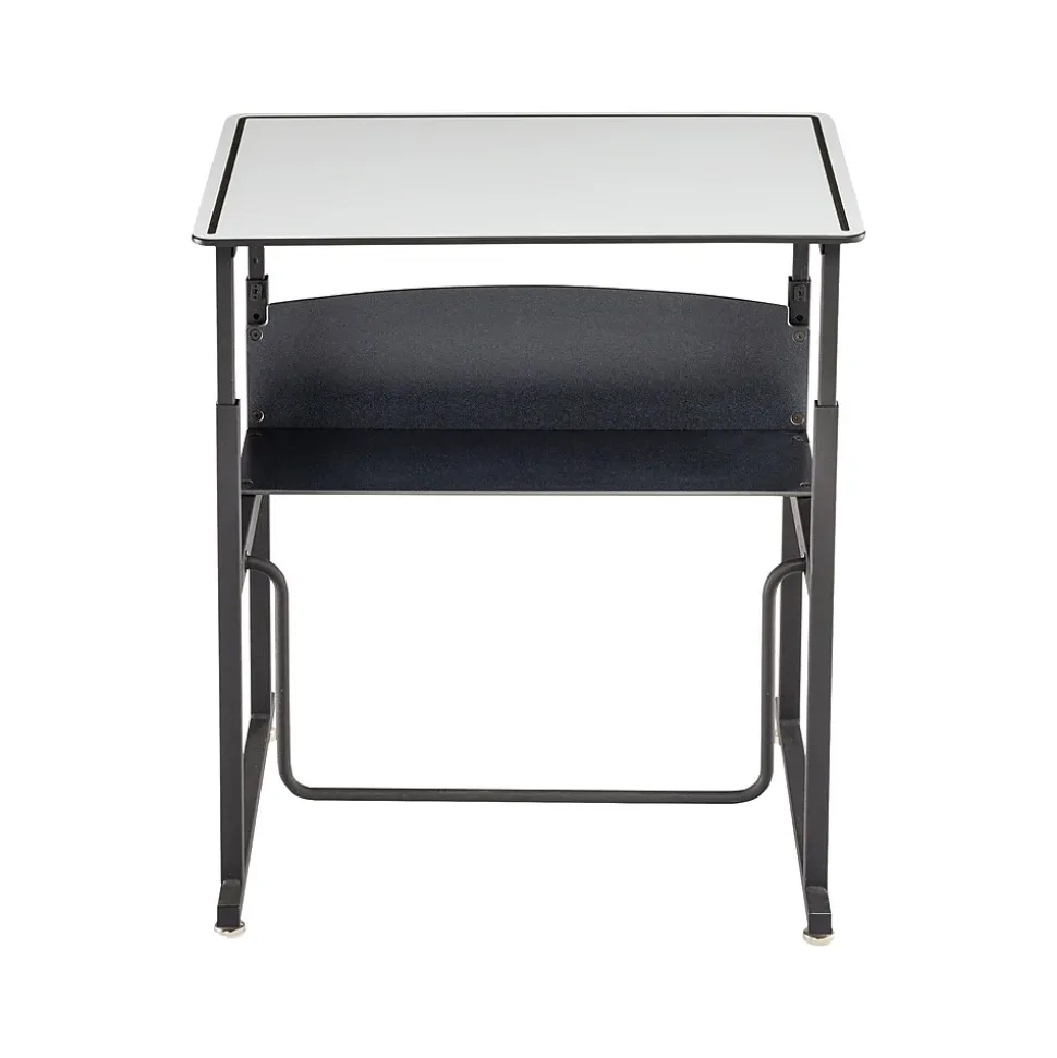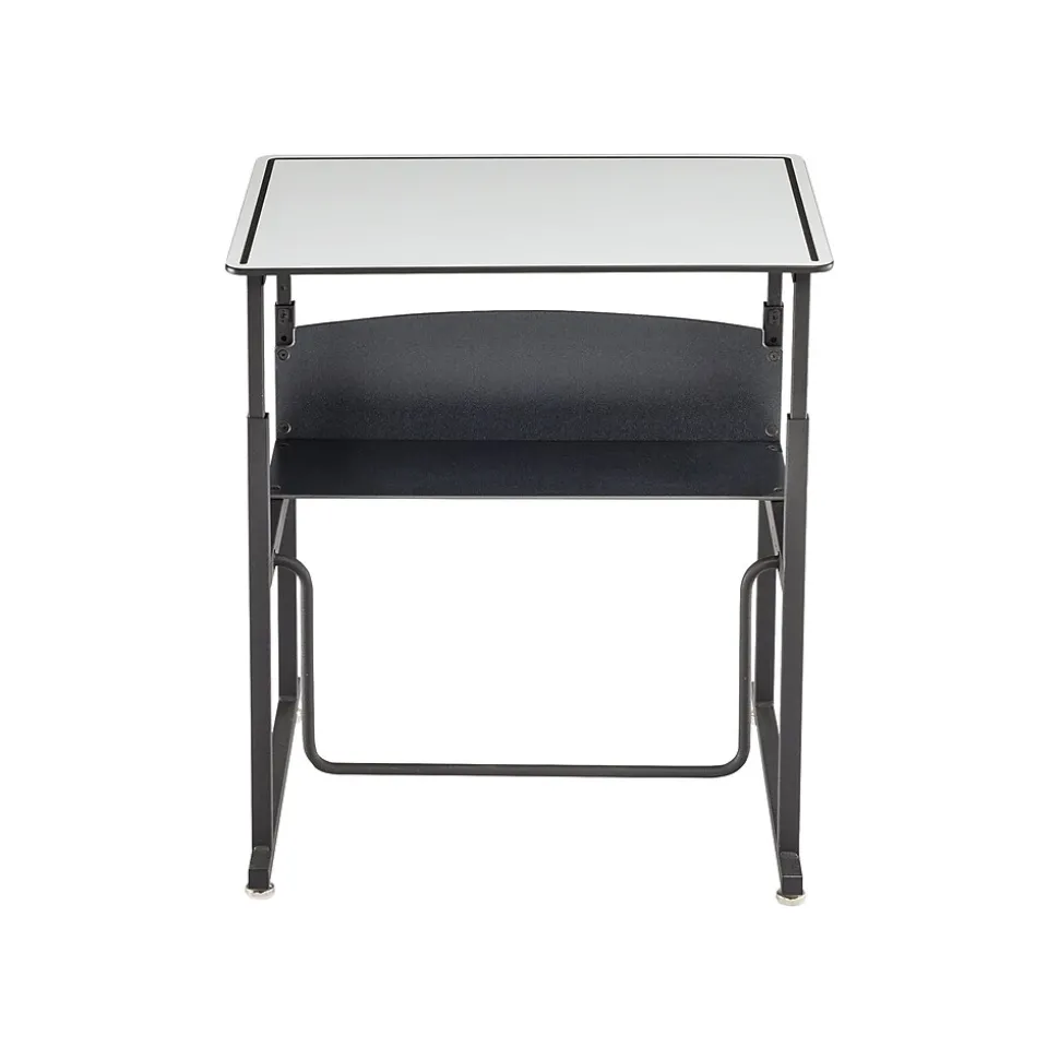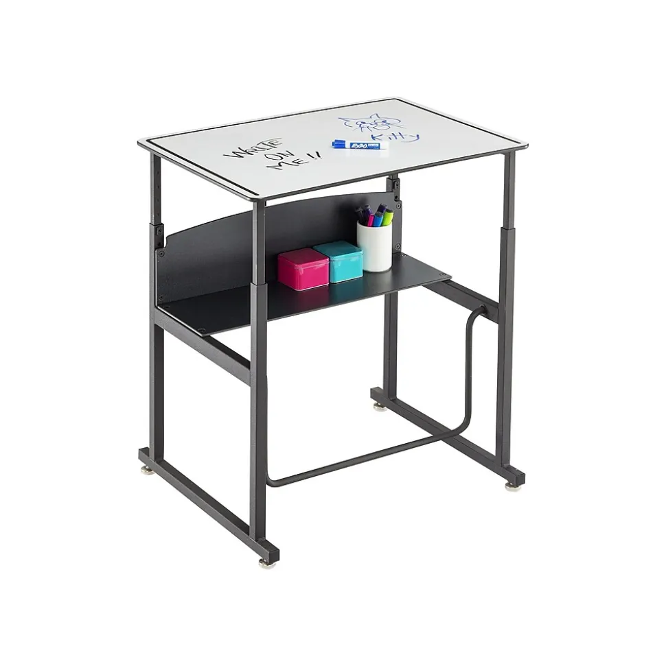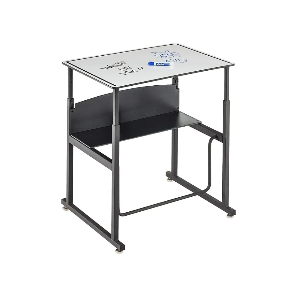 Safco AlphaBetter is an adjustable-height stand-up student desk with swinging footrest (fidget bar). Patented Swinging Pendulum footrest bar allows students to redirect excess energy and engage in continuous motion that may help support ergonomic comfort and cardiovascular health, while potentially increasing calorie burn, productivity, and focus. The desk features adjustable nylon base levelers for stabilization and easy movement across smooth and carpeted floors. Phenolic resin open shelf provides easily accessible storage area for school supplies and personal items.