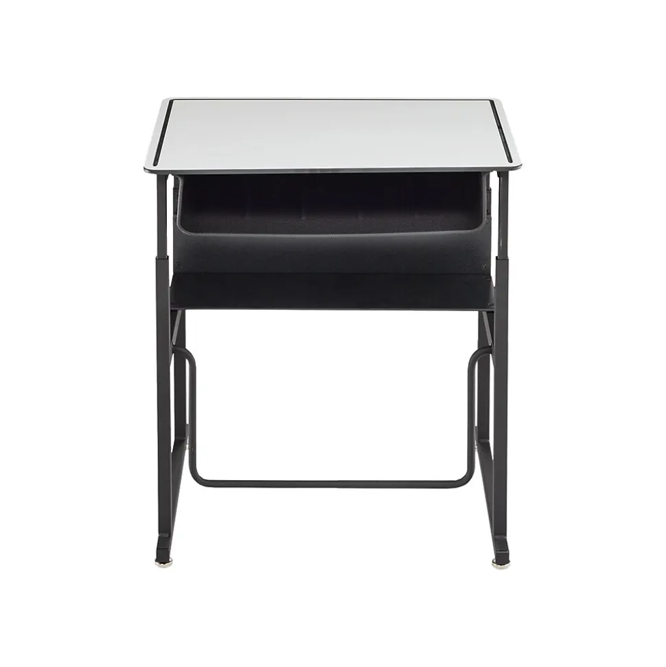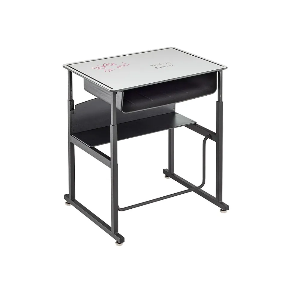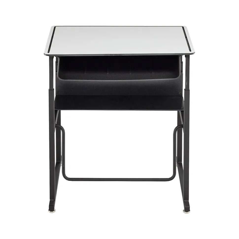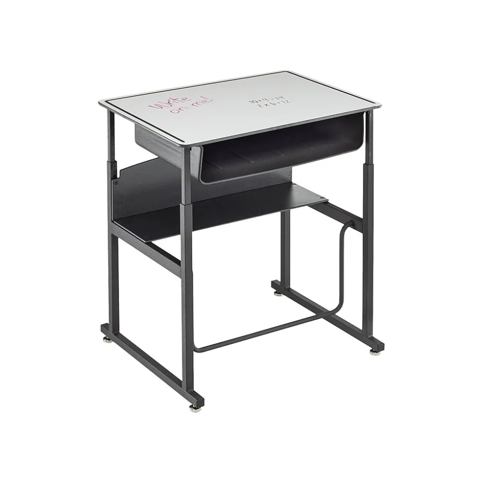Safco AlphaBetter is an adjustable-height stand-up student desk with swinging footrest (fidget bar). Patented Swinging Pendulum footrest bar allows students to redirect excess energy and engage in continuous motion that may help support ergonomic comfort and cardiovascular health, while potentially increasing calorie burn, productivity, and focus. The desk features adjustable nylon base levelers for stabilization and easy movement across smooth and carpeted floors. Phenolic resin open shelf provides easily accessible storage area for school supplies and personal items.