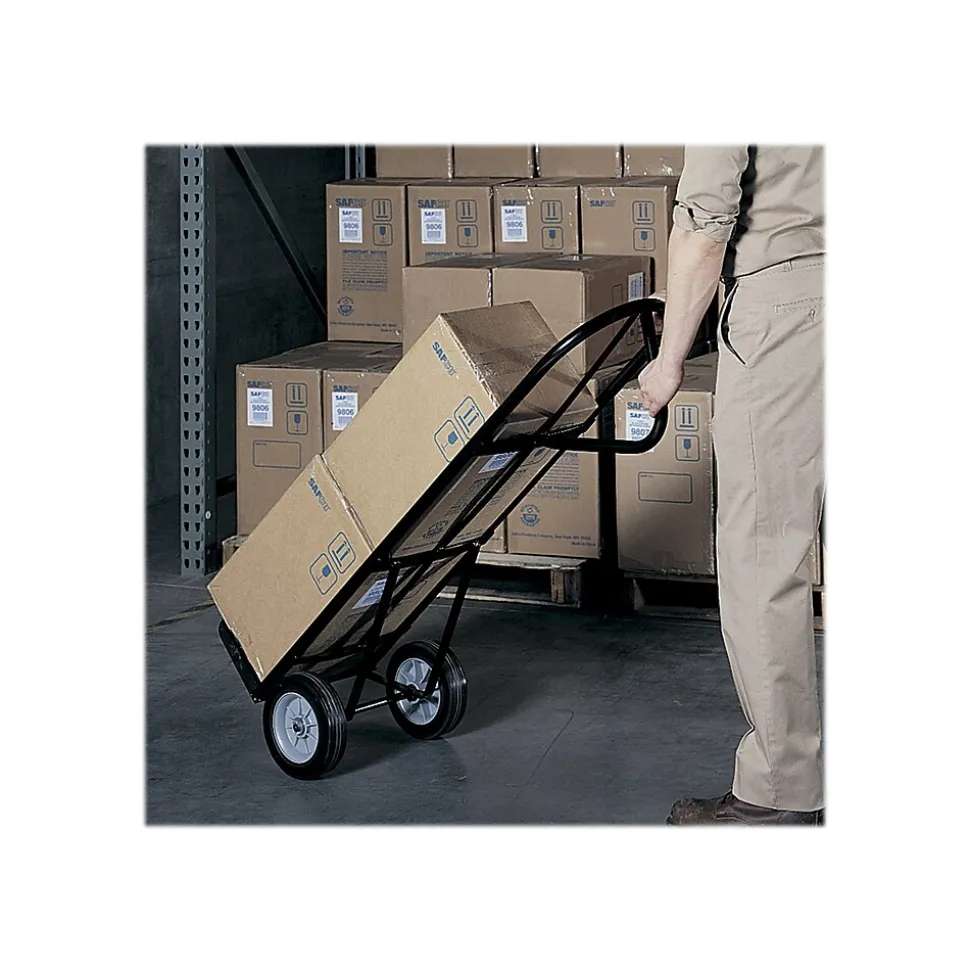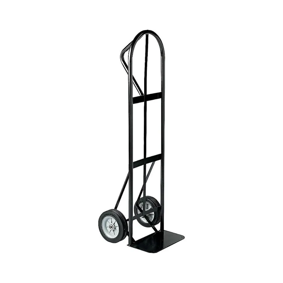 Make moving simple with this economy P-handle truck. Made with a heavy-gauge tubular steel frame with welded joints, this hand truck is strong, helping to prevent breakage while moving appliances, boxes and other similar items, and it has a capacity of up to 400 pounds, making it ideal for handling heavy loads. Solid 8-inch rubber wheels and ball bearings provide fast, smooth movement, ensuring an easy item-transportation experience, and the truck has a 7-foot long toe plate, providing plenty of room for large, bulky items. This Safco Tuff Truck economy P-handle truck has a black powder-coat finish, granting exceptional durability and a professional look.