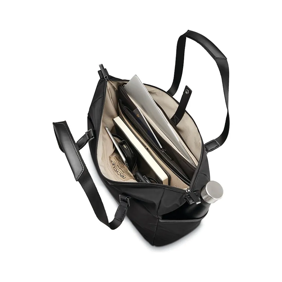 - Stylish tote bag features an exterior and interior lining made of Recyclex polyester created from 100% postconsumer recycled PET bottles; comes in black