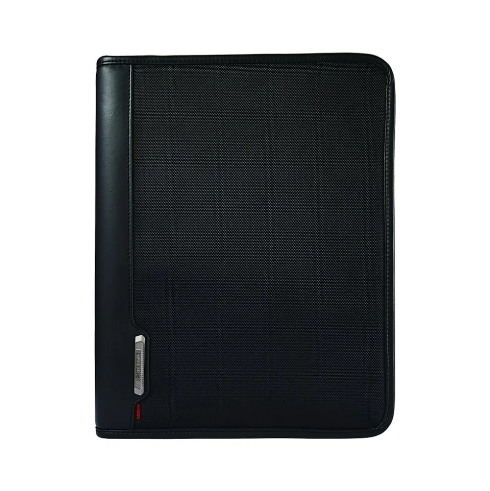 - Stylish black padfolio made of ballistic fabric with vinyl trim