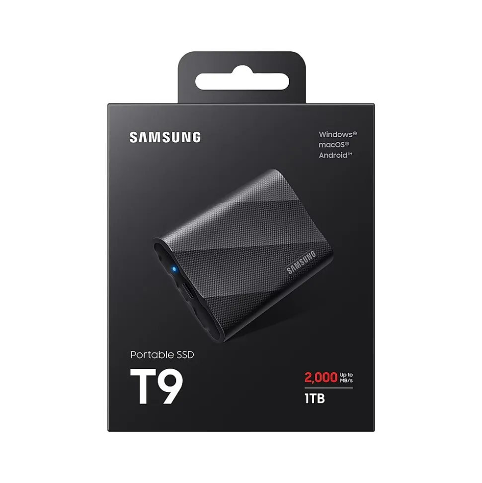 Enhance workflow efficiency with Samsung T9 1TB USB 3.2 portable solid state drive, boasting sequential read/write speeds of up to 2,000 MB/s through its USB 3.2 Gen 2×2 interface. T9 is compatible with Windows, macOS, Android phones and tablets, gaming consoles and 12K camera. Rest assured. T9 offers up to 3 meters drop resistance and is backed by a 5-year limited warranty.