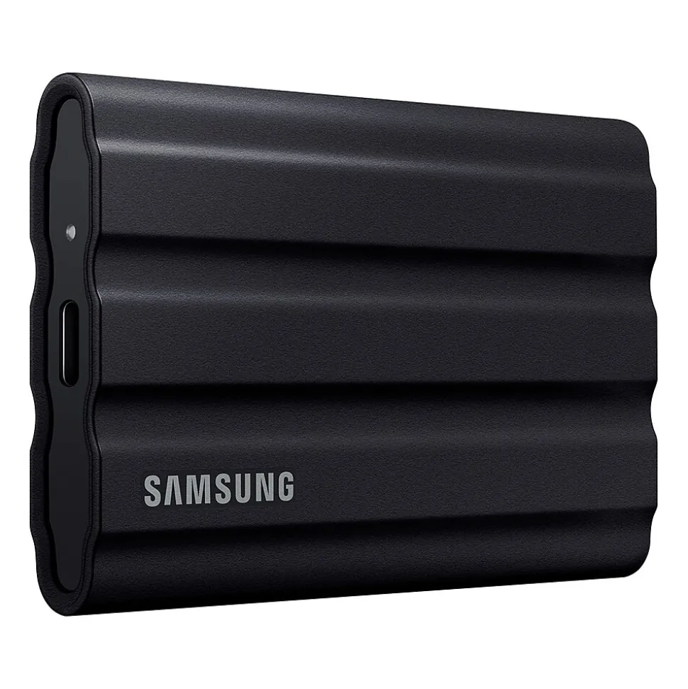 Tough, fast, and compact. The rugged T7 Shield SSD is built to endure with the space to create, thanks to an IP65 rating for dust and water resistance. Transfer massive files in seconds: USB 3.2 Gen 2 and PCIe NVMe achieve soaring sequential read and write speeds up to 1050MB/s and 1000MB/s, respectively, allowing you to edit directly from the drive. The high-tech rubber exterior with Dynamic Thermal Guard controls heat to maintain steady performance for even giant projects. Ready for the rough and tumble: shoot on location and wander the wild while feeling confident your data is securely protected from water and dust with the IP65 rating. The rugged design and advanced outer elastomer add extra durability to even endure a 9.8′ drop. The T7 Shield is compatible with Windows, macOS, and Android devices, gaming consoles, and more. Included in the box are USB Type-C to USB Type-C and USB Type-C USB Type-A cables for added convenience. A 1TB capacity gives you colossal space in a sleek colorway. The stylish rubberized grip prevents slips, so the SSD stays in your hands. Bring everything with you, and look great doing it. Experience the outstanding performance and reliability you expect from Samsung: all firmware and components, including Samsung’s world-renowned DRAM and NAND, are produced in-house, allowing end-to-end integration for quality you can trust.