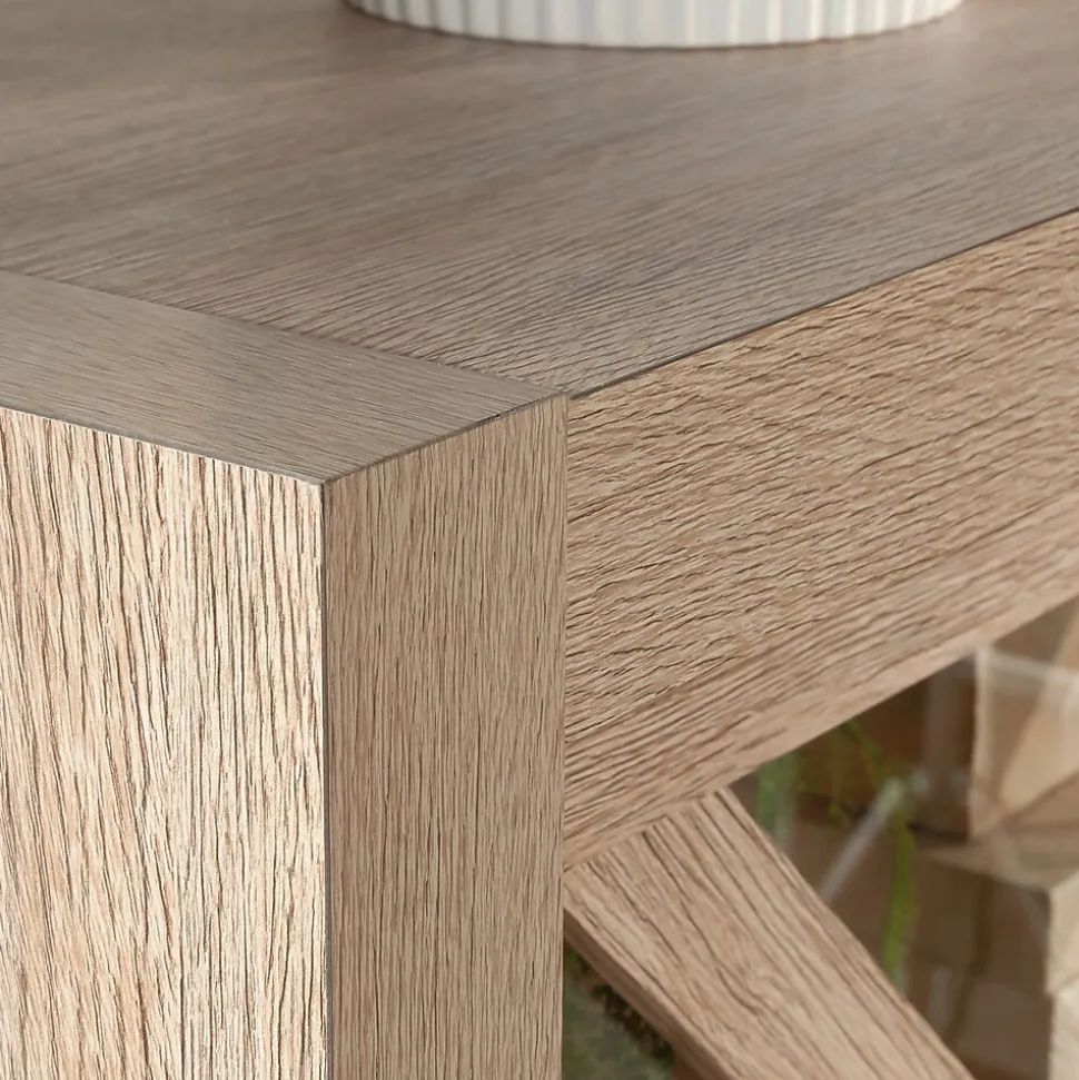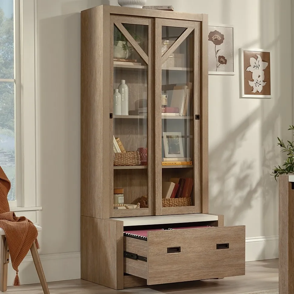The bookcase with sliding doors from the Dixon City collection has a rustic farmhouse appeal coupled with a touch of contemporary style. Finished in the natural tone of Brushed Oak with Pebbled White accent, the diagonal trestle detailing at the top of the glass doors lends an architectural element to the otherwise simple design. The safety-tempered glass sliding doors of this commercial bookcase open to reveal two adjustable shelves and a fixed shelf, designed to stylishly meet ever-changing storage demands. At the bottom of the bookcase with doors is a file drawer with full extension slides that will hold legal or letter size hanging files. This residential office furniture has strong and lightweight panel construction for added style and versatility of placement within your home office. This 4-shelf bookcase meets BIFMA standard x5.9 for safety, durability, and structural performance. Hardware with a rubbed bronze finish adds a touch of glam to this office storage bookcase, for the ultimate modern farmhouse meets luxury appeal.