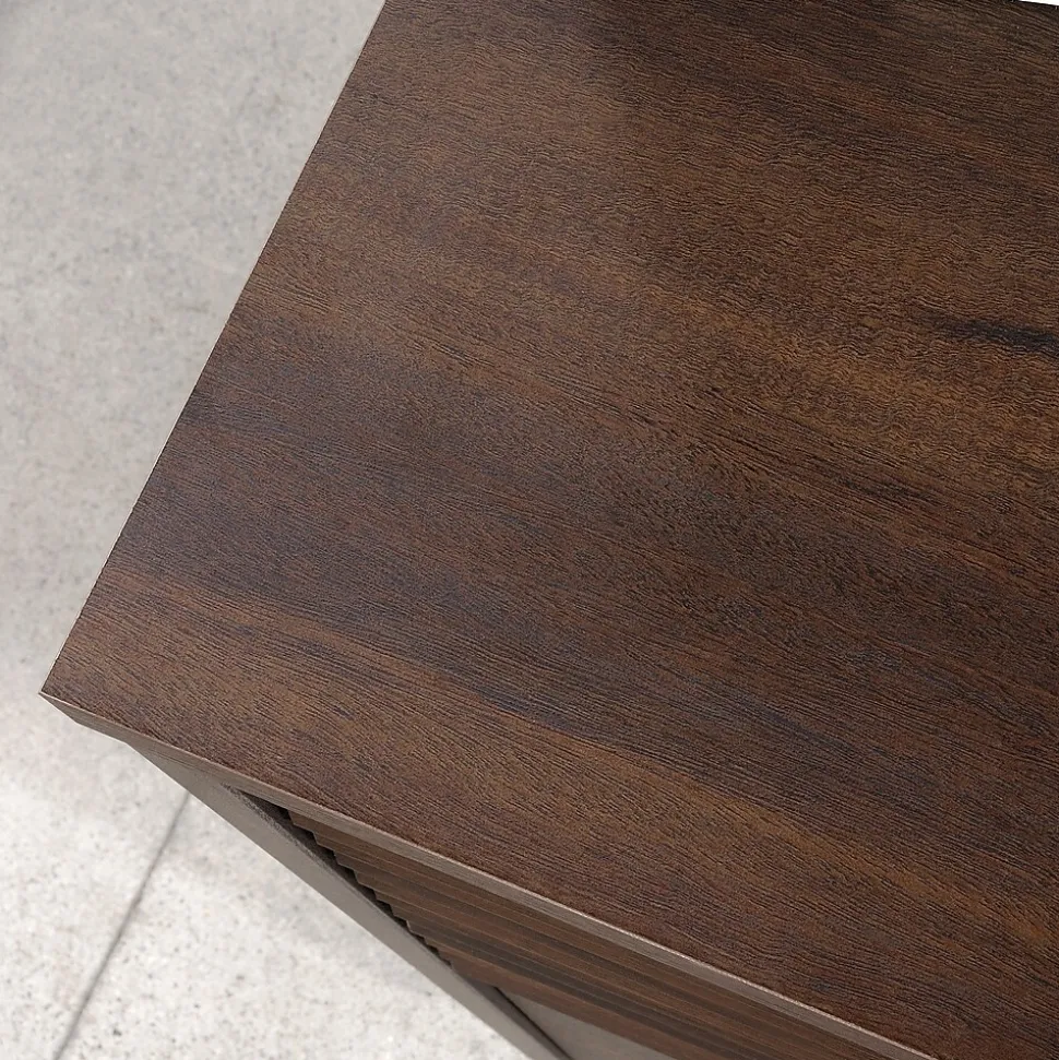 Mid-century style with 21st century function – This lateral file cabinet from the Palo Alto collection ensures an organized office. This 2-drawer lateral file cabinet comes fully assembled, with minimal hardware attachment required so you can organize your office as quickly as possible. Durable, 1 thick end panels and a 1 thick top has enough room for books, office decor, and a lamp to makes this a commercial filing cabinet you can count on. This lateral file cabinet includes a melamine top surface that is heat, stain, and scratch resistant. Impact resistant, high-grade thermoplastic edges increase the durability and longevity of this commercial office storage item. Two drawers with full extension sides hold letter or legal size hanging files. This 2-drawer lateral file cabinet includes an interlocking safety mechanism that allows only one drawer to open at a time. You can guarantee the security of your most important documents with a key lock on this resimercial lateral filing cabinet. Commercial filing cabinets that are finished on all sides, like this one, allow for versatile placement and a polished look from every angle. Finished in Spiced Mahogany, this lateral file will have your commercial office organized in no time.