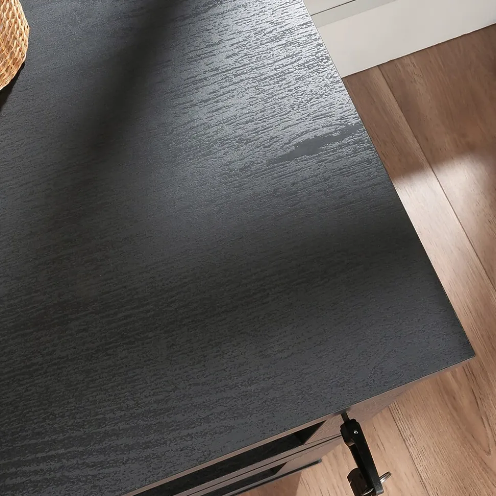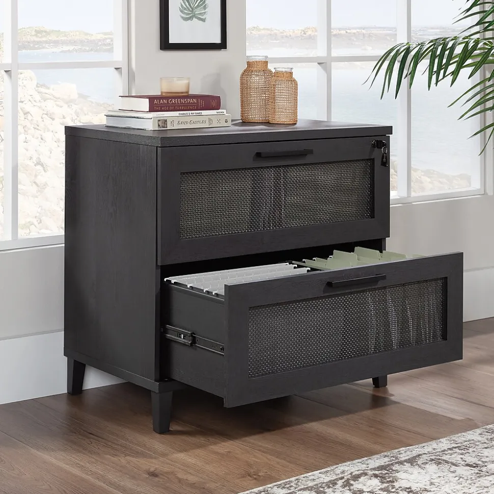 A traditional, yet modern addition to your home office is just a click away with this office filing cabinet from the Tiffin Line collection. This 2-drawer lateral file cabinet features large drawers with full extension slides that hold letter or legal-size hanging files. The drawer features a key lock for secure storage of your important documents. An interlocking mechanism allows only one drawer to open at a time for extra safety measures. Use the spacious top surface of this legal size filing cabinet to store and display items like a printer, wireless speaker, decorative plants, and photos of your family. Rattan inserts on the drawer fronts create a visually stunning centerpiece to any room. This lateral file cabinet is finished on all sides, so it will look polished from every angle. To ensure durability, it has impact resistant, high-grade thermoplastic edges and meets BIFMA testing standards. Finished in dark Raven Oak, this 2-drawer filing cabinet is a convenient and attractive storage solution for the home.
