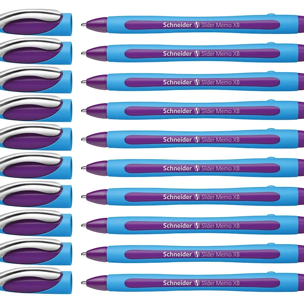 The Schneider® Slider Memo XB Ballpoint Pen features Viscoglide® ink technology for an extraordinarily smooth, gliding writing experience. The wear-resistant stainless steel tip enhances ink flow and guarantees the large ink supply can be fully used. The ink dries quickly, even on smooth paper, and is smudge-proof when highlighting it later on. The ergonomically shaped, rubberized barrel is designed to reduce hand fatigue during longer writing sessions and provides a secure grip. Cap with sturdy metal clip fits neatly on either end of the pen. Writes in extra broad line width (XB), or 1.4 mm, violet ink. The Slider Memo XB is produced CO2 neutral and made in Germany.