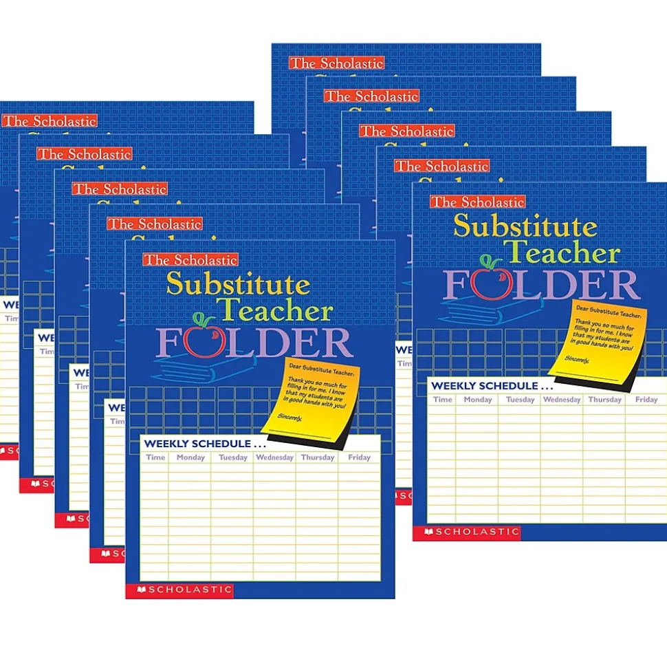 This full-color folder includes ample space for filling in all the information a substitute teacher needs! Features a handy storage pocket, charts, checklists, helpful notes, and more. Sold as a pack of 10 folders.
