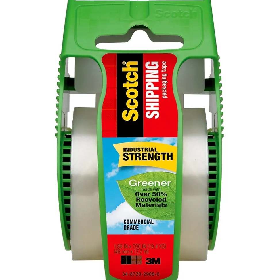 Protect what you ship-and feel good about it too: With Scotch Commercial Grade Greener Shipping Packaging Tape. This tough tape stands up to all the bumps your packages go through. It’s also made from over 50% recycled materials (tape and dispenser material)-so it’s strong in use and keeps the environment in mind. Designed for industrial performance-holding up to 30 lbs per inch (tensile strength)-it keeps what’s inside the box sealed securely. Instead of layers of tape, you need only one strip at a time to keep boxes closed tight-even those made of hard to stick, 100% recycled materials. Go with the packing tape that gives you Commercial Grade strength made greener – all in one.