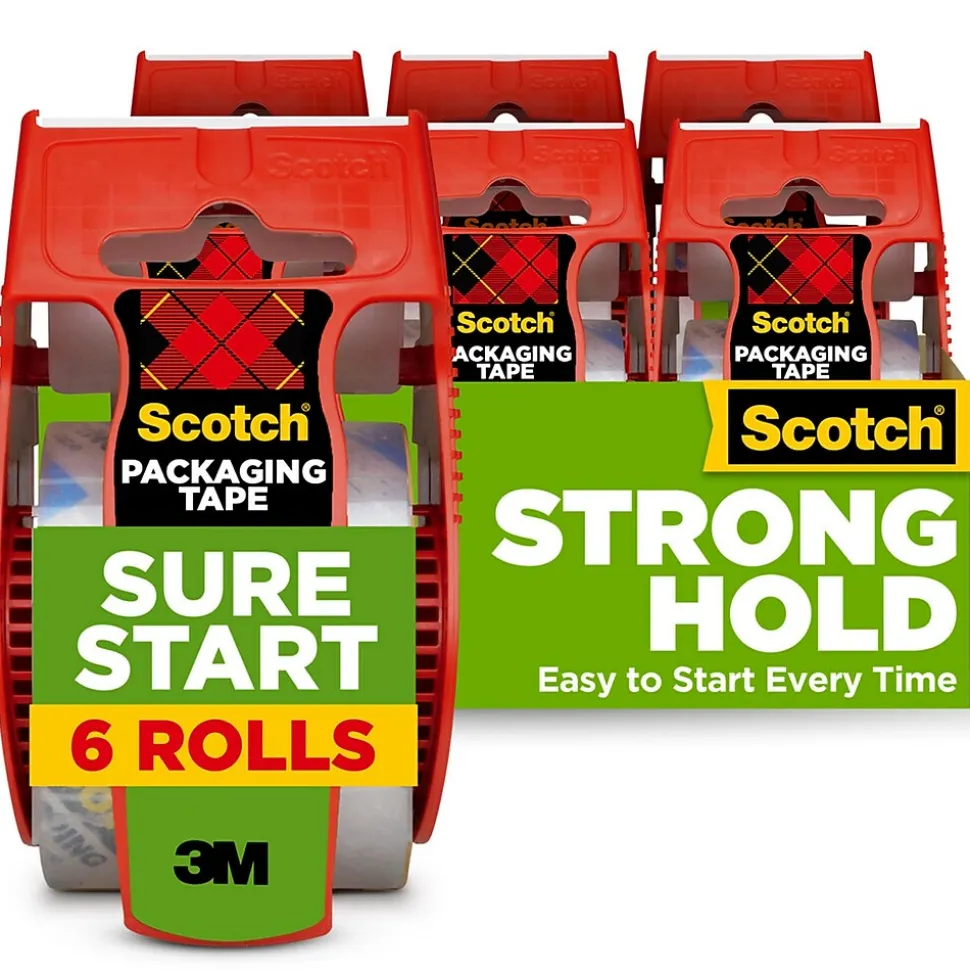 - PACKING TAPE: 6 rolls of Scotch Sure Start Packing Tape with dispensers; unrolls easily and smoothly, without a frantic search for the end of the tape