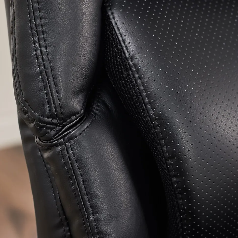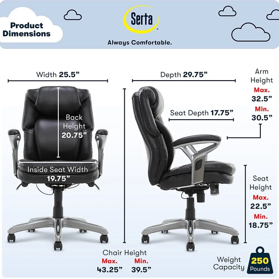 Create a more comfortable working environment with this Serta AIR Health and Wellness office chair. Deep, layered body pillows and a segmented cushion design deliver full-body support, while the soft bonded leather offers an inviting texture. The sleek finish and modern silhouette bring executive-level style to your office, creating a focal point in the room. Use the pneumatic height adjustment to move the seat up or down to match the height of your desk. The padded armrests feature one-touch adjustment options for a customized setup. This Serta AIR Health and Wellness office chair features AIR lumbar support, which flexes and pivots with your body to cushion and support your back.