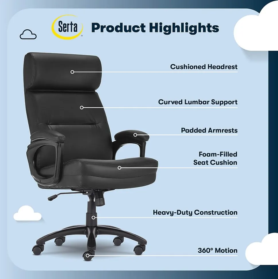 The better you sit, the better you’ll feel. Whether for work, play, or any other activity that has you sitting in our chairs, we believe comfort is everything. We know it’s a big responsibility and take it seriously, just as we do with our mattresses. With over 15 years of making chairs and innovating with designs, materials, and technology, Serta knows what it takes to give you a comfortable sit. The Serta Comfort series of office chairs offers a luxuriously cushioned seat, backrest, and armrests filled with thick, non-recycled Serta foam and upholstered in a soft breathable bonded leather to keep you cool and comfortable during extended use. This chair seamlessly blends its comfort with sleek design, accented by a single channel tuft. Choose from Black, Brown, Gray, or Cognac to find the perfect match for your workspace. This executive big & tall model is a high-back design which can be helpful for people who tend to experience discomfort due to long sitting periods. High-back chairs offer upper back, shoulder, and neck support and encourages proper spinal alignment by supporting the back in a neutral position which helps reduce muscle fatigue and promotes a better overall posture. The 360° swivel metal base on double-wheel casters glides smoothly across carpets or rugs, and can handle up to 350 lbs. Finding your ideal seated position is easy with the one-touch side lever for convenient height adjustment to match your work style and desk set-up. Whether you’re conquering emails or squeezing in work between kid duty and dog walks, the Serta Comfort Executive Big & Tall office chair will transform your home office into a command center of productivity.