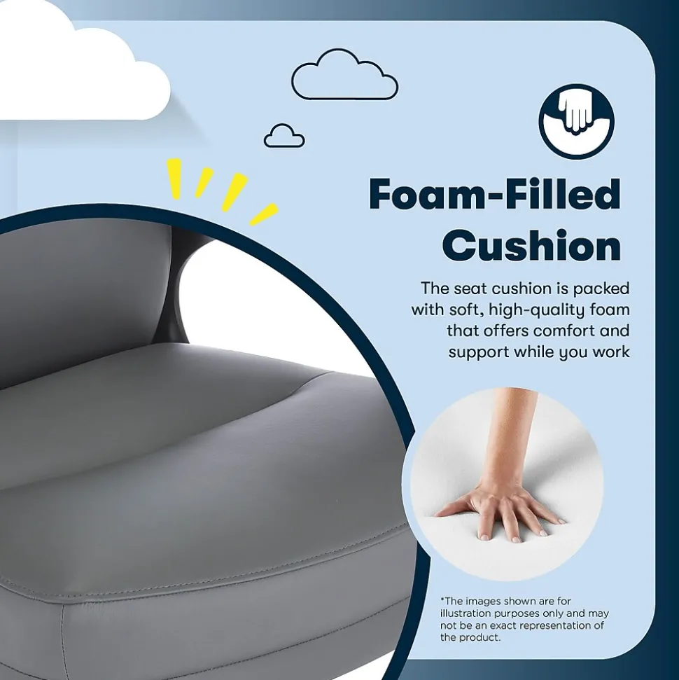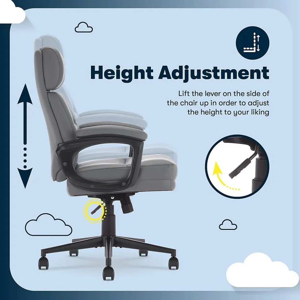 The better you sit, the better you’ll feel. Whether for work, play, or any other activity that has you sitting in our chairs, we believe comfort is everything. We know it’s a big responsibility and take it seriously, just as we do with our mattresses. With over 15 years of making chairs and innovating with designs, materials, and technology, Serta knows what it takes to give you a comfortable sit. The Serta Comfort series of office chairs offers a luxuriously cushioned seat, backrest, and armrests filled with thick, non-recycled Serta foam and upholstered in a soft breathable bonded leather to keep you cool and comfortable during extended use. This chair seamlessly blends its comfort with a sleek design accented by a single channel tuft. Choose from Black, Brown, Gray, or Cognac to find the perfect match for your workspace. This executive model is a mid-back design. Mid-back chairs can be beneficial for those who tend to slouch in high-back chairs, as the lower lumbar support encourages active sitting and prioritize core engagement. It will also enable you to shift positions and stretch more easily throughout the day, helping to prevent muscle fatigue and discomfort that can lead to poor posture. The 360° swivel metal base on double-wheel casters glides smoothly across carpets or rugs, and can handle up to 275 lbs. Finding your ideal seated position is easy with the one-touch side lever for convenient height adjustment to match your work style and desk set-up. Designed for comfort, but delivering stylish ergonomics, the Serta Comfort Executive Mid-Back Chair is your workday partner for crushing emails, pumping out a project or slaying your study time.
