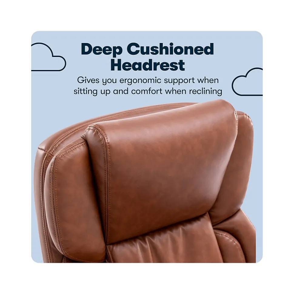Bring relaxation to your busy workday with the Serta Garret executive office chair. Serta kept comfort in mind while designing this desk chair, with luxurious layered body pillows, a contoured lumbar zone, and padded armrests for all-day ease and exceptional support during long periods of sitting. The waterfall seat edge reduces pressure on the back of the legs and increases circulation, which helps decrease fatigue while seated. The ergonomic office chair features both recline and seat height adjustment settings, allowing you to find your optimal seating position. This desk chair is upholstered in supple bonded leather with contrast stitching for comfort and style in any workspace.