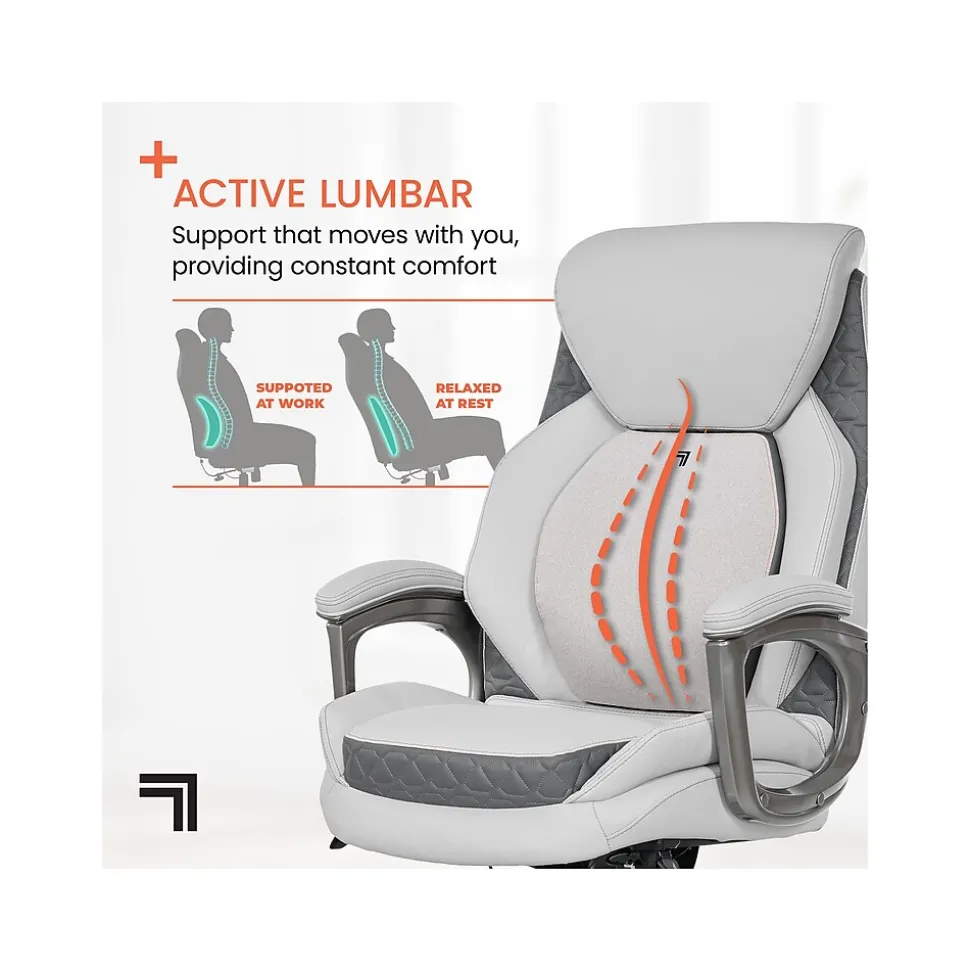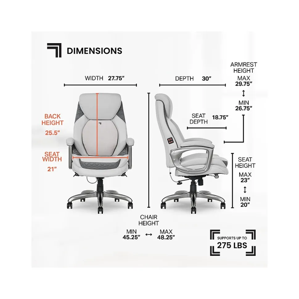 The Sharper Image executive massage chair with heat and active lumbar support is a perfect addition to the office. Offers active lumbar support that moves with you, providing constant comfort. Features supportive seat with plush multilayered construction and 360-degree casters.
