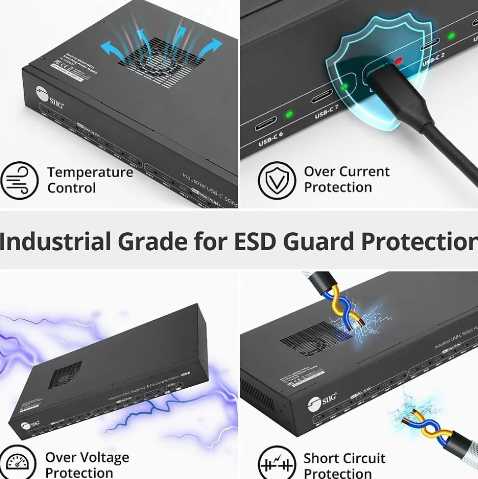 Power Saving Industrial Grade USB-C 5Gbps Hub & PD Charging Station – 600W, Adds 16 USB-C Charging Ports, 2-port 100W & 14-port Charging up to 30W; 14 Port USB Hub, Data Transfer up to 5Gbps, PD 2.0 & 3.0 for 5V/3A, 9V/3A and 12V/2.5A, Over Current, Over Voltage, Over Heating, Short Circut, ESD Protection, Metal Housing, UL CertificationFeatures | Unrivaled Charging Capability600W total power output ensures sufficient power for all connected devices 16 USB-C charging ports 2 ports deliver up to 100W for fast charging laptops and tablets 14 ports offer up to 30W for charging smartphones, wearables, and other devices Supports PD 2.0 & 3.0 ensuring compatibility with a wide range of devices Multiple voltage outputs: 5V/3A, 9V/3A, and 12V/2.5A for flexible charging options Built-in Meanwell brand power IC with UL certification USB 5Gbps Data TransferDelivers 14-port USB-C data port via one system or Dual system share the dual USB-C input port Support data transfer up to 5Gbps and PD charging back to system up to 100W Effortlessly handle large files, backups, and data-intensive tasks Includes USB-C to A+C Adapter CablesThis cable use for iPhone 15, Plus / Pro / Pro Max, iPad Pro, iPad Mini when using data sync on USB-C 1 to 7 port and not compatible with “Host” portPlease plug the USB-A to C adapter to ID-US0B11-S2 USB-C 1 to 7 port, and then plug the USB-C connector of the cable to iPhone 15 or iPad Pro / iPad Mini device. This can let the iPhone 15 or iPad Pro / iPad Mini device charging and do the data sync simultaneously, not just chargingRobust Safety FeaturesOver Current Protection: Guard against excessive current and potential damage Over Voltage Protection: Ensure safe voltage levels for all connected devices Over Heating Protection: Smart temperature control to prevent overheating Short Circuit Protection: Instant response to protect your devices from electrical mishaps ESD Protection: Safeguard against electrostatic discharge for longevity Ensures charging station and the connected devices safe Multiple Connectivity Ports2x USB-C Input: Host 1&2, PD 100W 14x USB-C Output: Data transfer up to 5Gbps, PD 30W 19″ Rack Mountable Metal HousingHeat dissipation and durable metal shell rack, can be mounted into a standard 1U of EIA-standard 19-inch rack using ear-mounts (included)Industrial Grade DurabilityWithstands wear and tear in various harsh environmentsPower SavingIt is designed with a power switch to allow users to conserve energy when the hub is not in use. There is also a built-in LED to indicate power statusAutomatic Temperature ControlEnables to turn on/off the fans automatically according to the temperature setup>55°C: Start the fans automatically <55°C: Cut off the fans automatically