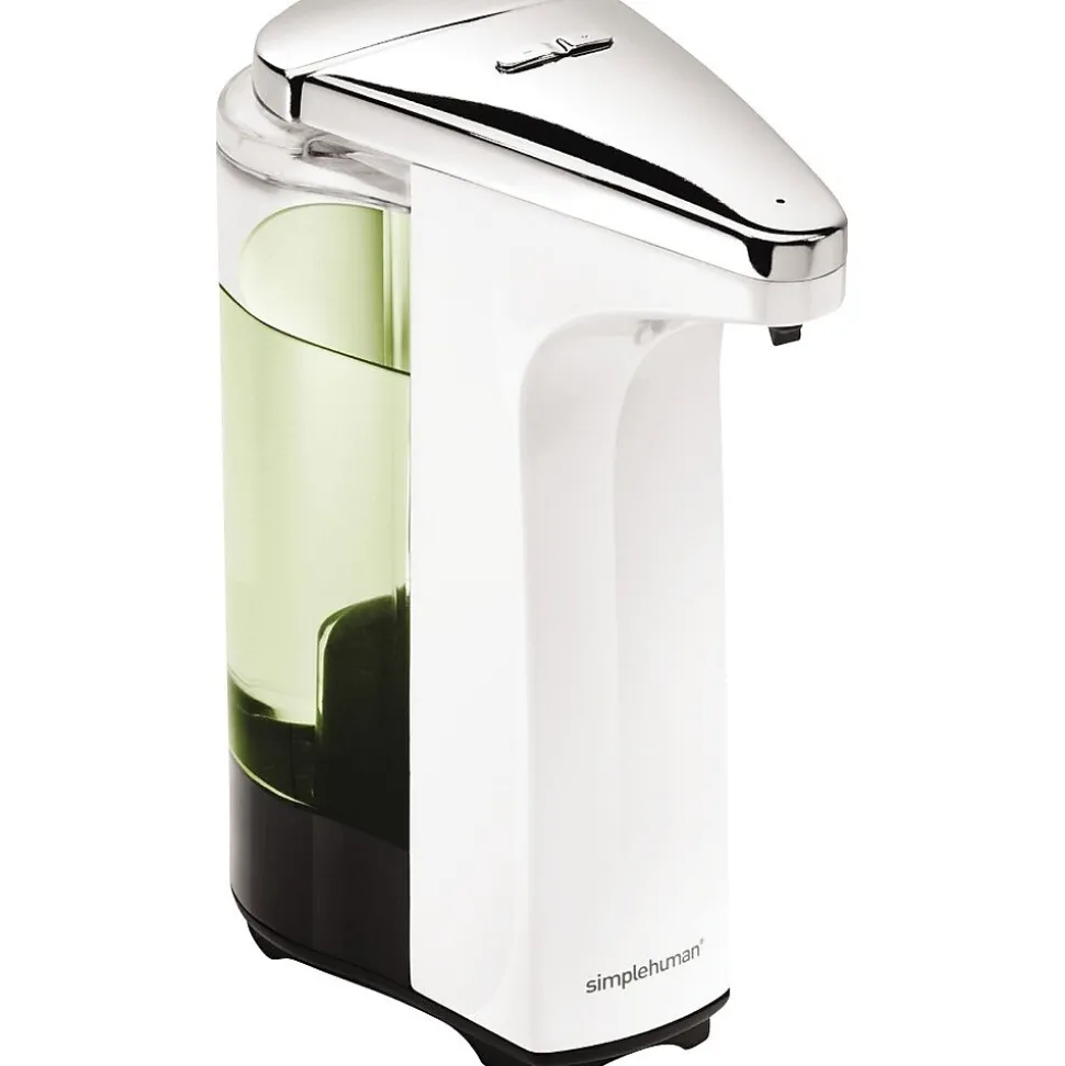 Simplehuman Compact sensor pump soap or sanitizer dispenser in white color features silicon valves to prevent messy drips and clogs. Pump with wide opening makes refills easy and is perfect for countertops.
