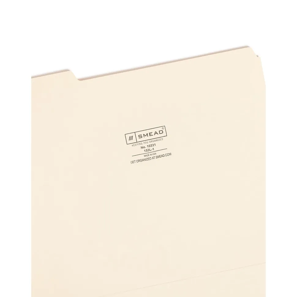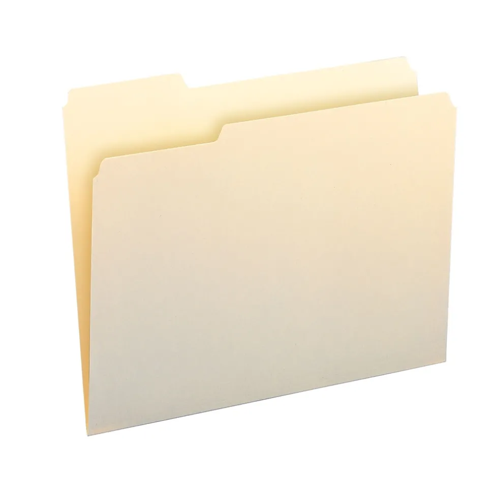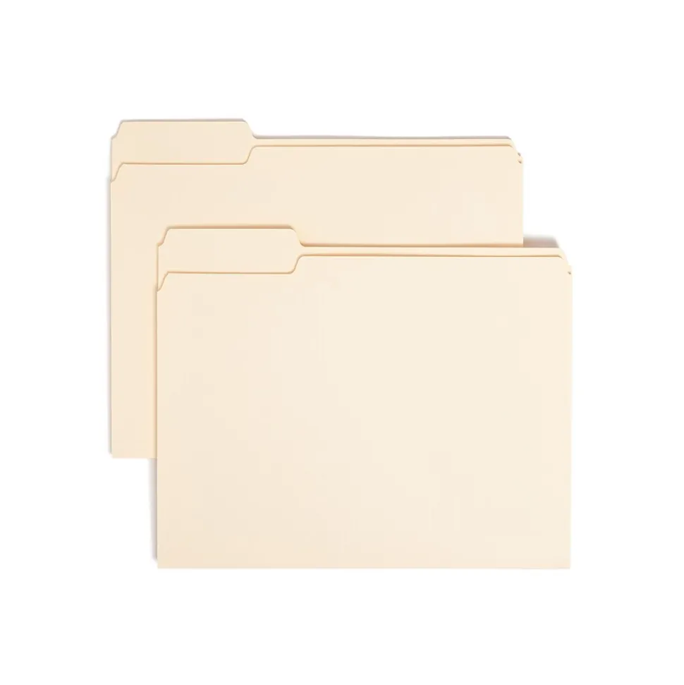 Organize documents with these guide-height manila file folders. Packaged in a box of 100, these sturdy folders are ideal for restocking filing supplies, and the reinforced two-ply tabs provide enhanced durability for repeated use. These Smead letter-size file folders are made from 11-point manila stock, keeping contents free of dirt and damage.