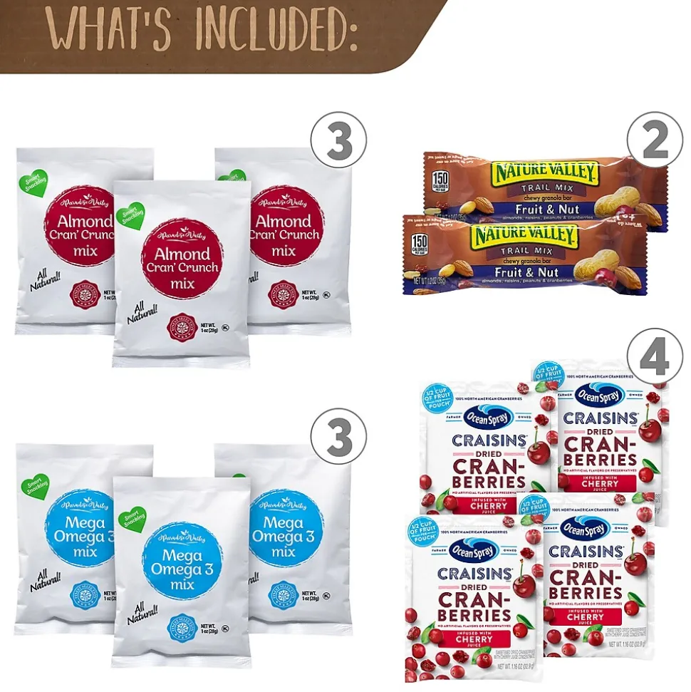 - Box includes Welch’s Fruit Snacks, Ocean Spray Craisins, Planters Peanuts & Cashews, Blue Diamond Almonds, Wonderful Pistachios, Bare Chips Variety, Paradise Valley Mega Omega Mix & Almond Cran Crunch Mix, Nature Valley Fruit & Nut bars, Sour Cran Sour Watermelon and Sour Cran Sour Raspberry