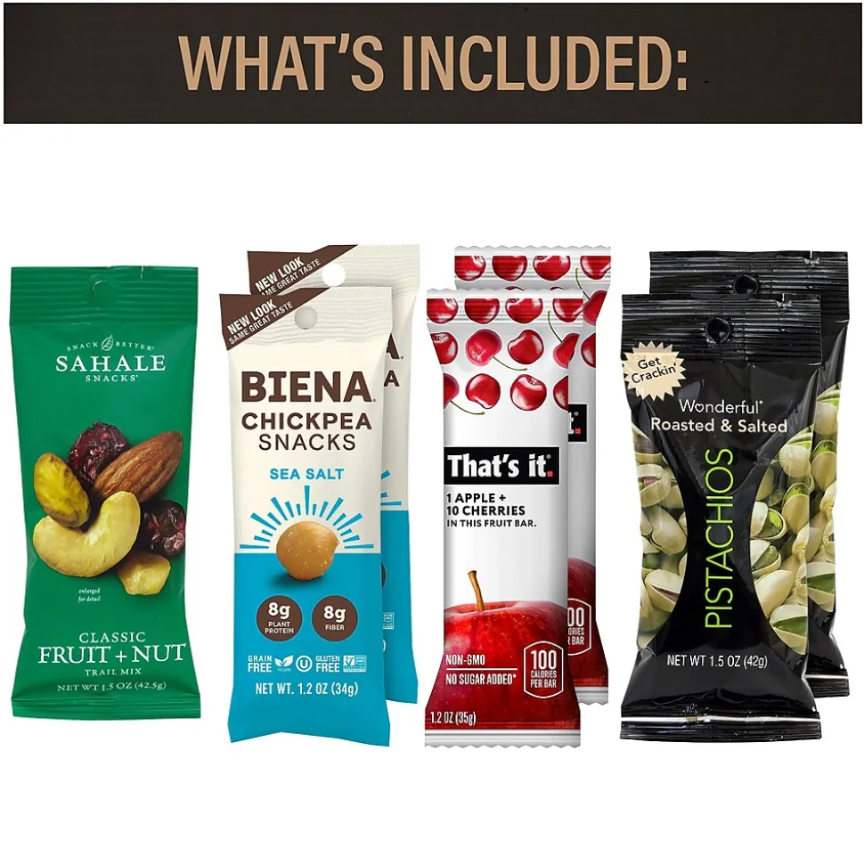 - 2 bags of HIPPEAS Organic Chickpea Puffs Sriracha Sunshine, 2 THAT’S IT Gluten Free Apple + Cherry Fruit Bars, 3 bags of Skinny Pop 100 Calorie, 2 bags of WONDERFUL Roasted & Salted Pistachios, 1 bag of SAHALE Snacks Classic Fruit & Nut Trail Mix, 3 MADEGOOD Organic Chocolate Chip Granola Bars, and 2 bags of BIENA Chickpea Sea Salt Snacks