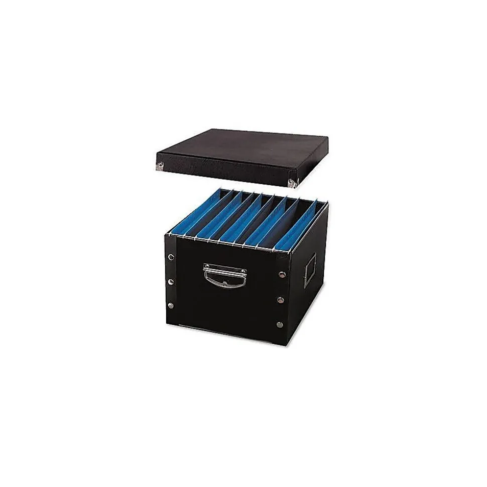 Keep your desk free from paperwork clutter with this collapsible storage box. The black color and chrome accents add a professional look, making this box a handsome addition to your office. A spacious storage compartment offers ample space for letter-size and legal-size folders, and the simple design allows for quick, easy setup. With a sturdy lid, this Snap-N-Store storage box protects paperwork from dust and damage.