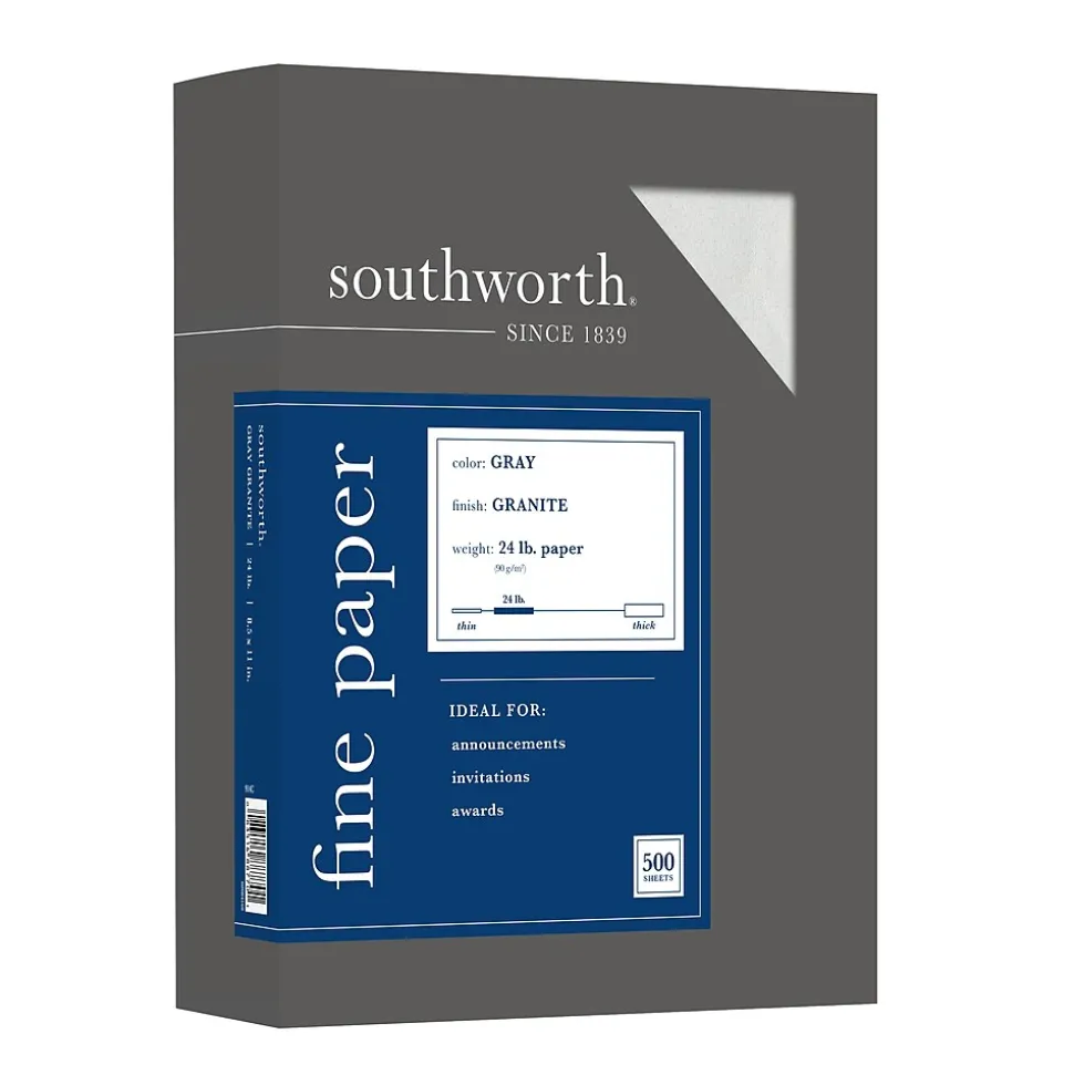 Give letters and other prints an eye-catching look with this specialty paper. The 24-pound paper stock provides a sturdy feel that prevents ripping and wrinkling, while the granite finish and gray coloring offer a high-quality appearance. This Southworth gray specialty paper is letter-sized and works great in most laser and inkjet printers.