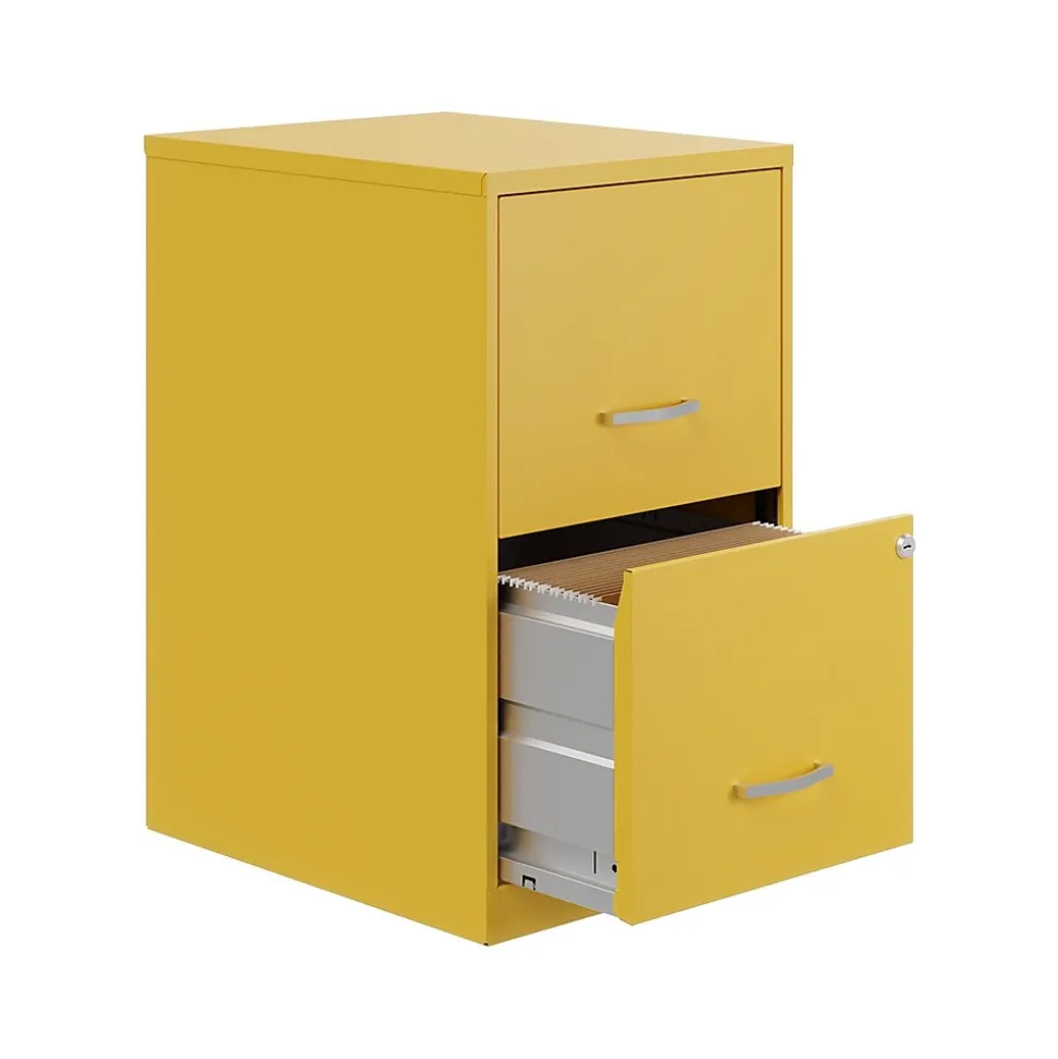 The Two Drawer Metal Vertical File Cabinet is designed for smaller professional offices or home office use. The cabinet features durable steel construction and a smart, efficient design that works well in small spaces, fitting easily under most work surfaces or office desks. Each drawer features high-sides to accommodate letter-sized hanging files. The drawers are also a perfect storage solution for other office essentials. Using a patented glide suspension, the drawer slides open and close smoothly with a three-quarter drawer extension to prevent tipping. In addition, you can keep your files and possessions secure with its locking drawers. The painted steel surface is non-porous and easy to clean. Bring storage and organization to your home or office with this stylish two-drawer file cabinet. Your office supplies and files will always be organized and within reach.