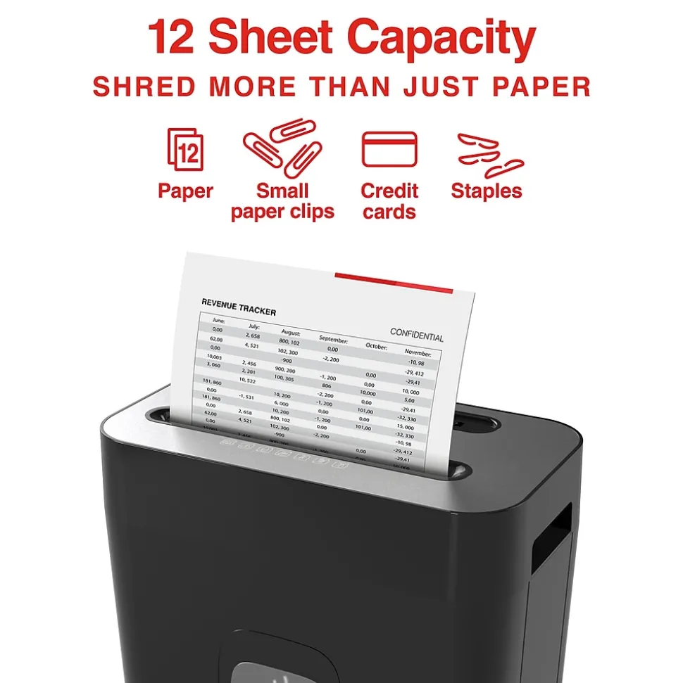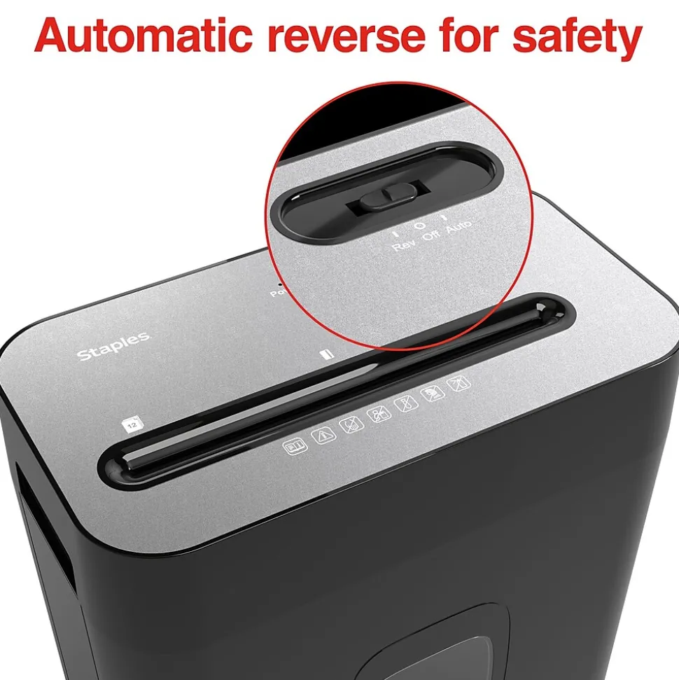 This easy-to-empty Staples Cross-Cut Shredder features powerful blades to keep your disposed documents safe. With a P-4 security level rating designed for day-to-day personal paperwork and emails, this unit takes your data down to 4.3mm x 33mm pieces. The Staples 12-Sheet Cross-Cut Shredder can shred paper, credit cards and staples for home and office use. Auto reverse loading prevent jams and overheating so you can shred documents without wasting time.