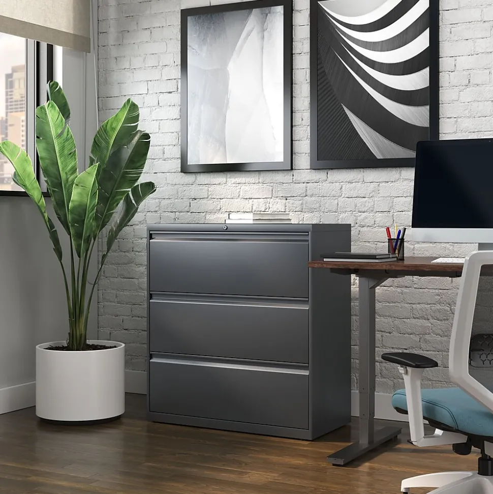 Get a durable, space-efficient solution to record storage with this three-drawer lateral file cabinet. Featuring a compact design, this cabinet fits easily in workplaces of all sizes and has a fine black finish and a sleek appearance that blends well with existing decor. The three 36-inch-wide drawers offer ample space for letter and legal-size hanging folders, ideal for document storage and recordkeeping. This lateral file cabinet lets you manage access to stored materials with a built-in lock.