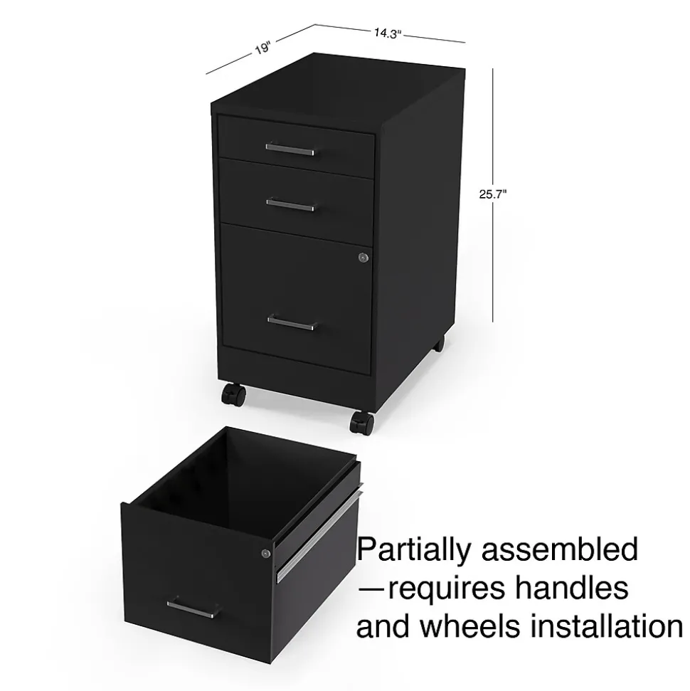 Expand your available storage options with this mobile file cabinet. Two box drawers offer space for office supplies, personal belongings and other small items, while the letter-size file drawer keeps paperwork close at hand. A keyed lock system prevents unauthorized access, keeping contents stored securely inside. This cabinet features rolling casters, so you can move your documents virtually anywhere in your workspace. With its compact size, this three-drawer vertical file cabinet fits neatly under a desk or in smaller spaces.