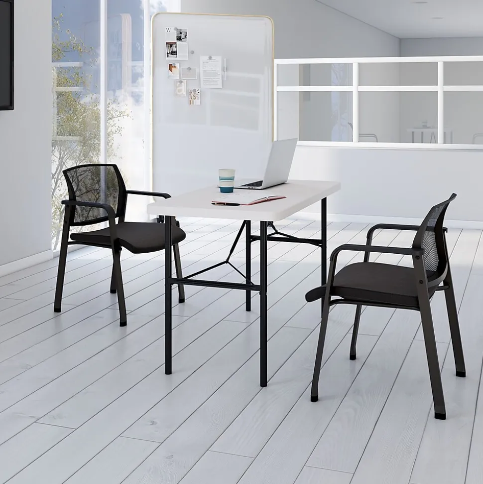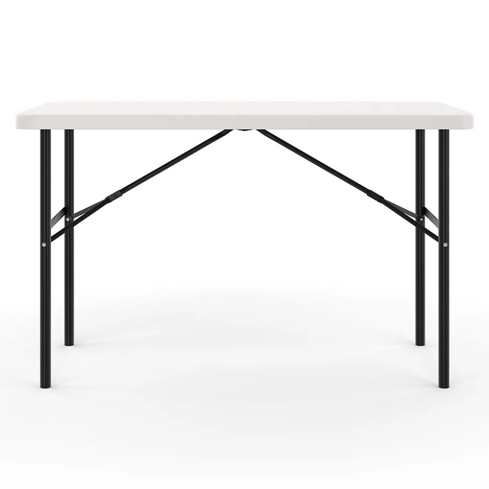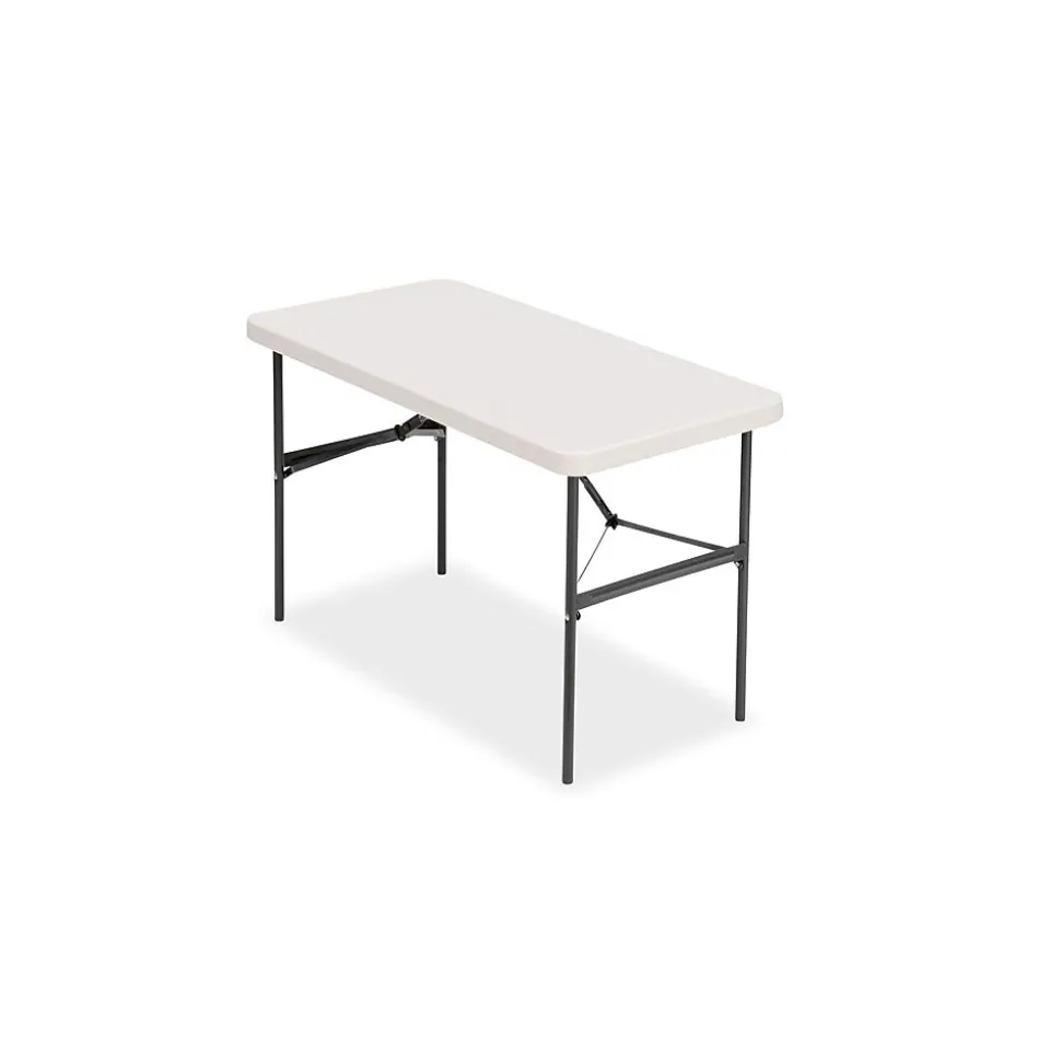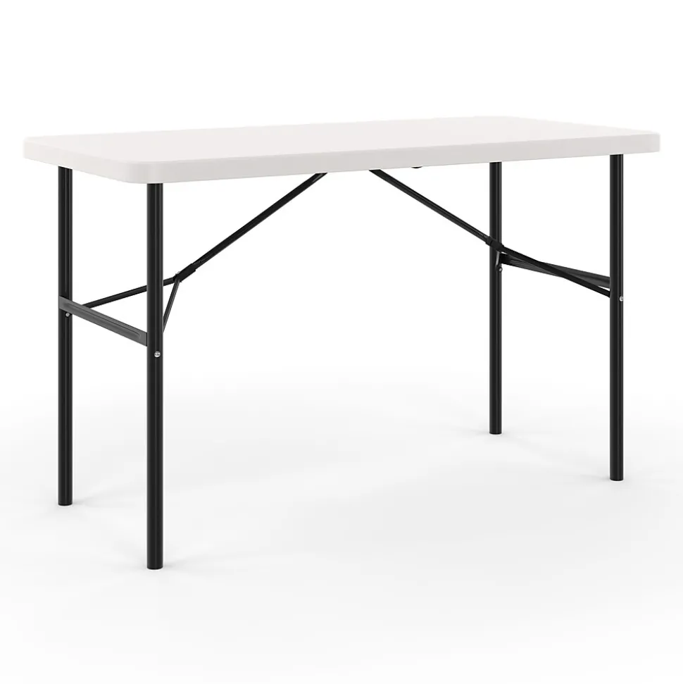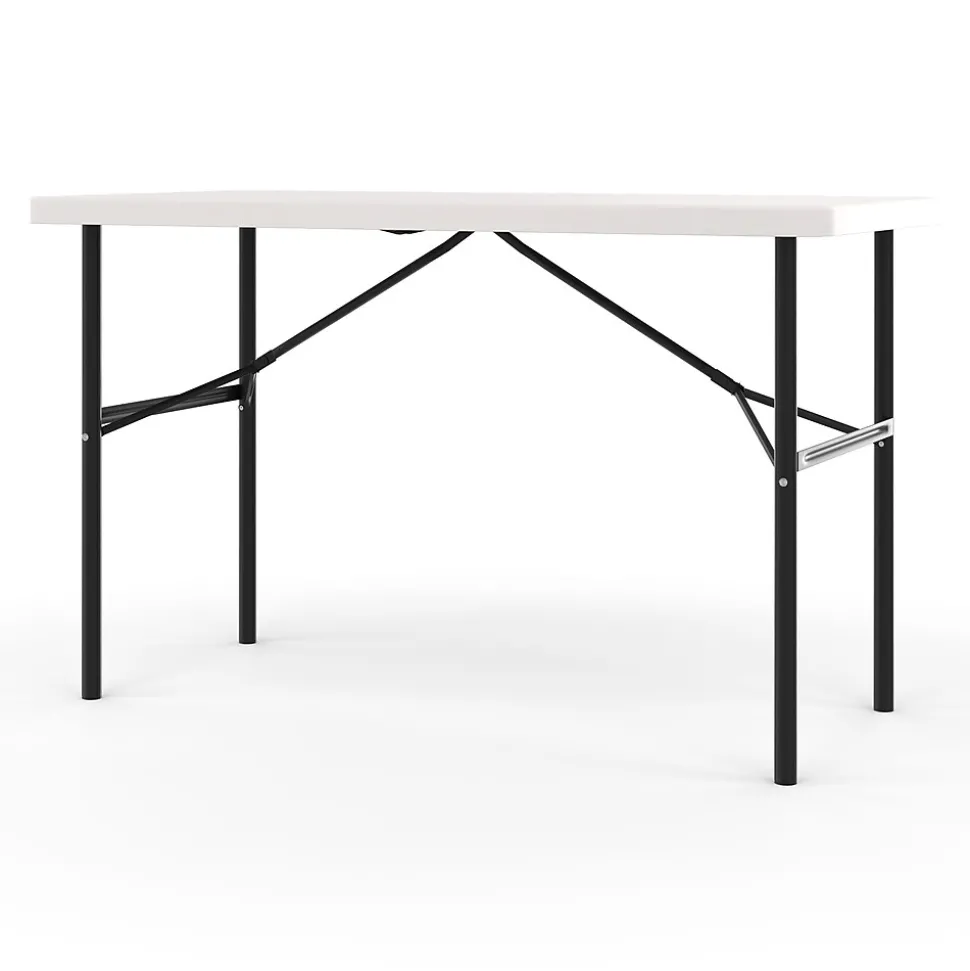 Make your next event a success with this light, easily moveable 4-foot folding table. Ideal for events such as banquets and conferences, this portable table accommodates up to four people, and the lightweight design and folding metal legs make setup easy. The 2-inch thick scratch- and stain-resistant resin polyethylene surface ensures lasting durability, while the rugged frame offers reliable stability and lets this table support up to 500 pounds. This folding table offers ample surface space to accommodate large amounts of food, merchandise and literature.
