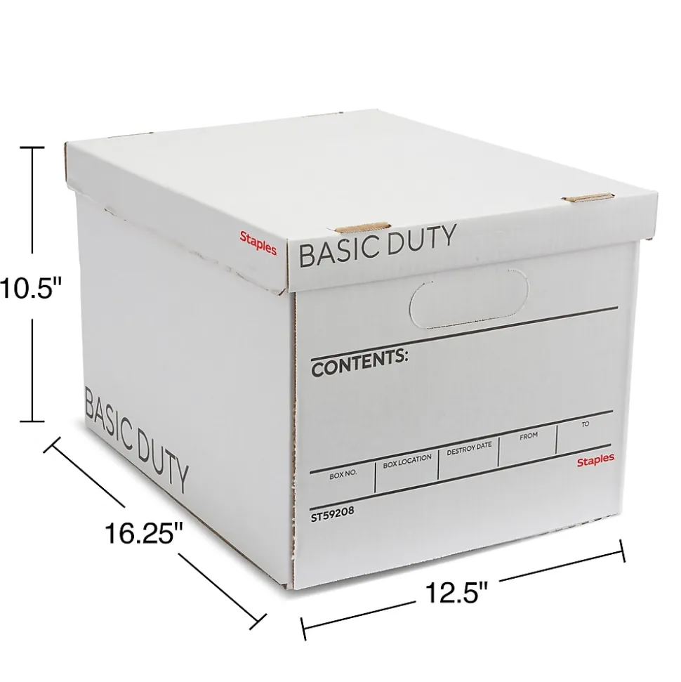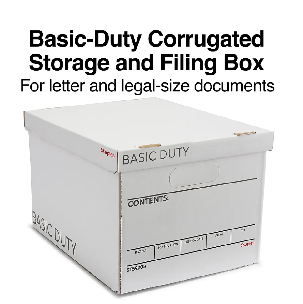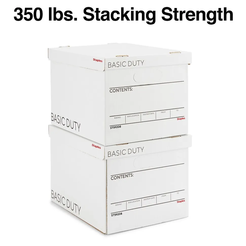 Contain bulk office files with this 10-count pack of corrugated storage boxes. A preprinted write-in area allows labeling for quick identification, while the lift-off lid offers access to stored letter-size and legal-size documents. With a stacking strength of 350 pounds, these boxes withstand piling. These Staples basic-duty corrugated storage boxes have easy-grip handles for enhanced portability.