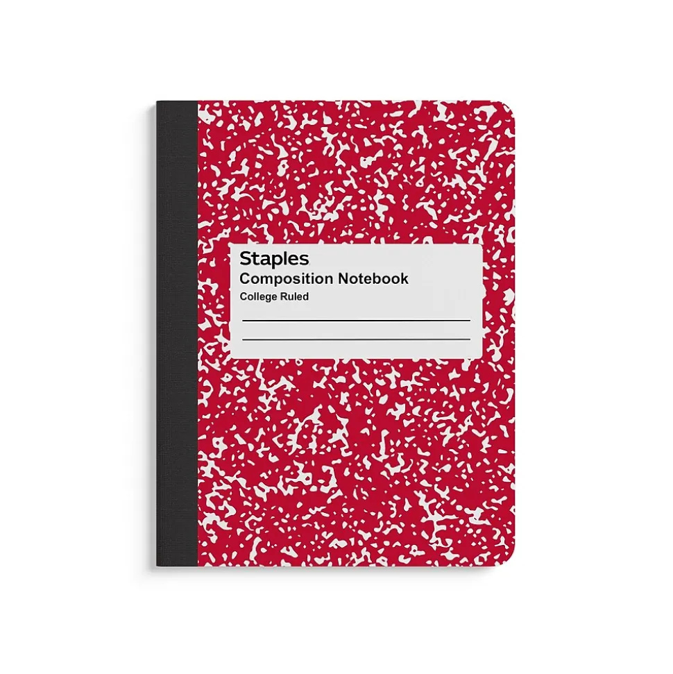 Prepare for meetings or lectures with this red and white composition notebook. With 100 sheets of college-ruled paper, this notebook lets you fit plenty of content in a compact space. The stitched binding holds pages secure, and the standard size is ideal for keeping your notes organized. This Staples 7.5 x 9.75-inch red and white composition notebook has a sturdy cover to keep your notes protected.