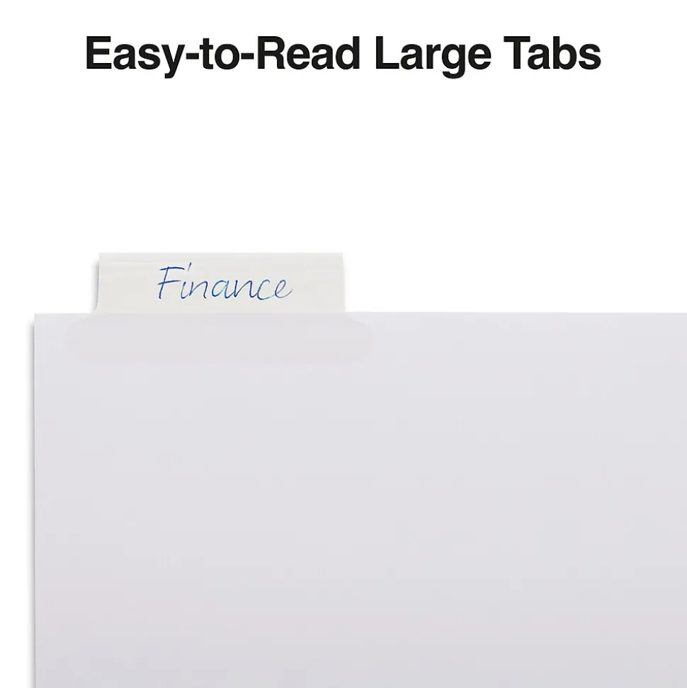 Flip open to the papers you need fast by using these Staples five-tab insertable clear dividers. Each divider boasts double-sided gold reinforcing strips to prevent them from ripping out, while the clear tabs let you insert your own custom labels of any color. These Staples five-tab insertable clear dividers can be printed using preset layouts in popular software programs such as Microsoft Word and WordPerfect.