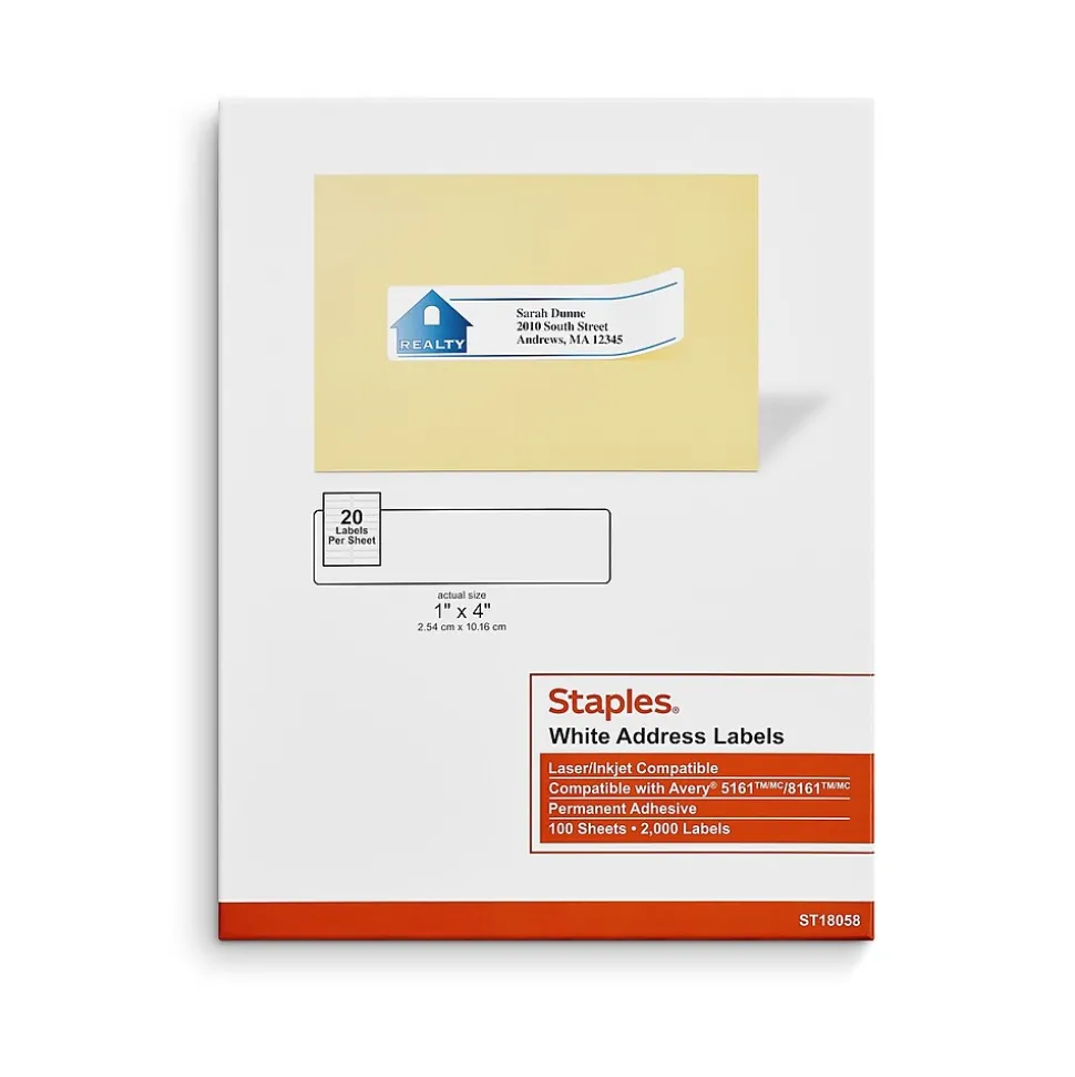 Ensure your company’s envelopes are easy to read with these Staples inkjet/laser address labels. Adhesive backings affix securely to your mailings, and the white color creates a neutral background for your custom designs. These Staples inkjet/laser address labels offer compatibility with Microsoft Word, WordPerfect, Avery LabelPro and a host of other popular design programs, providing convenient access to templates and designs.