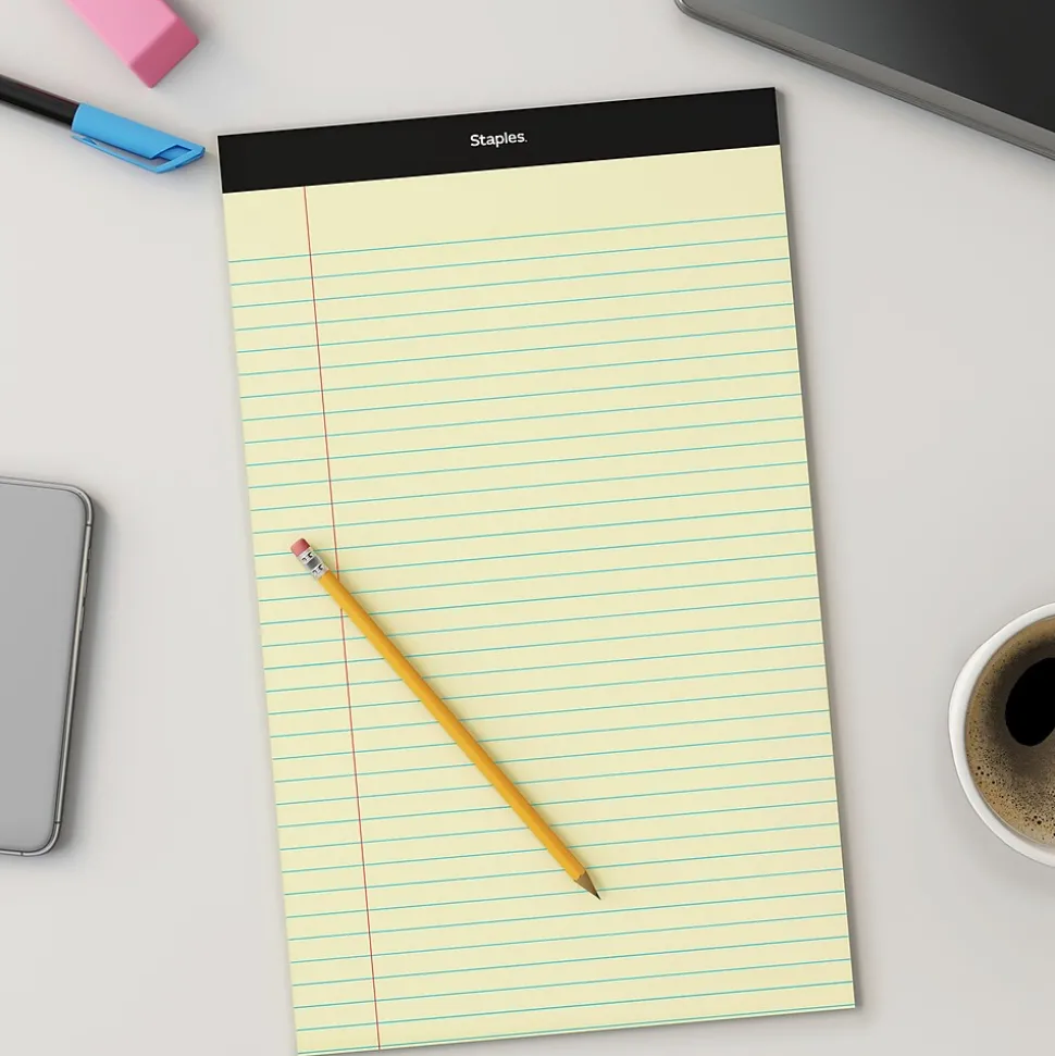 Stock your conference room or lecture hall with these canary wide ruled 50-sheet notepads. The perforations let you cleanly tear off a page, while the wide ruling helps keep your writing neat. These legal-size Staples 8.5 x 14-inch canary wide ruled notepads have a top-bound design so you can quickly rifle through the sheets and find information.
