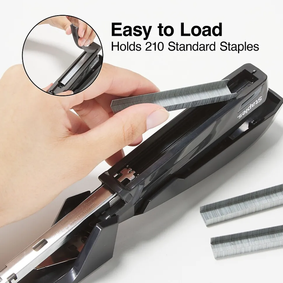 - Stapler holds full-strip capacity staples to minimize the need to reload
