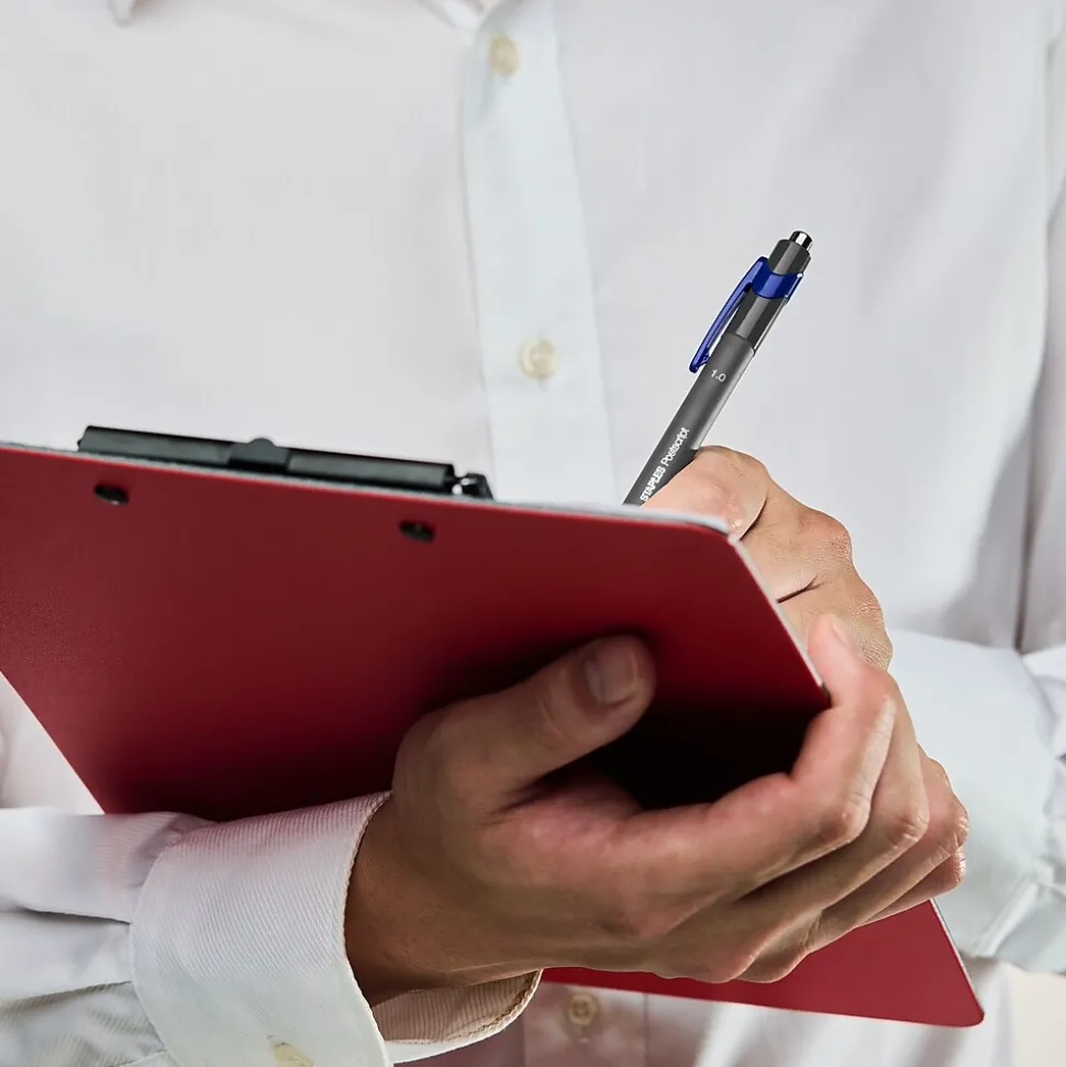Take notes with these Staples Postscript retractable ballpoint pens. The rubber base provides a no-slip grip, while the retractable design helps prevent unwanted marks on clothing or surfaces when not in use. These Staples Postscript retractable ballpoint pens are made with a compact design and come in a pack of 12, making it easy to keep your home or office stocked.