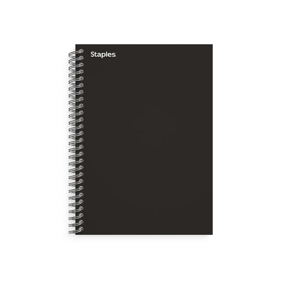Take meeting and lecture notes with this 80-sheet notebook. The strong twin-wire binding holds up to daily use and allows for flat placement, letting you access information quickly. College-ruled paper accommodates many lines of text for efficient use. This Staples Premium 4.38 x 7-inch black 1-subject notebook features a pocket divider to hold cards and loose documents, and the sturdy cover offers durability.