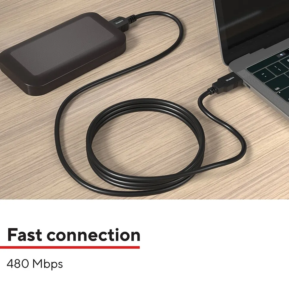 Connect peripheral devices like printers, copiers, external drivers and more with the Staples TECH USB-A to USB-C cable. The 16-foot cord offers ample length to connect devices across your work space, and the USB 2.0 boasts fast data transfer speeds up to 480 Mbps. Keep your workday running smoothly with the Staples TECH USB-A to USB-B cable. Backed by Staples Brands 100% satisfaction guarantee, or your money back.