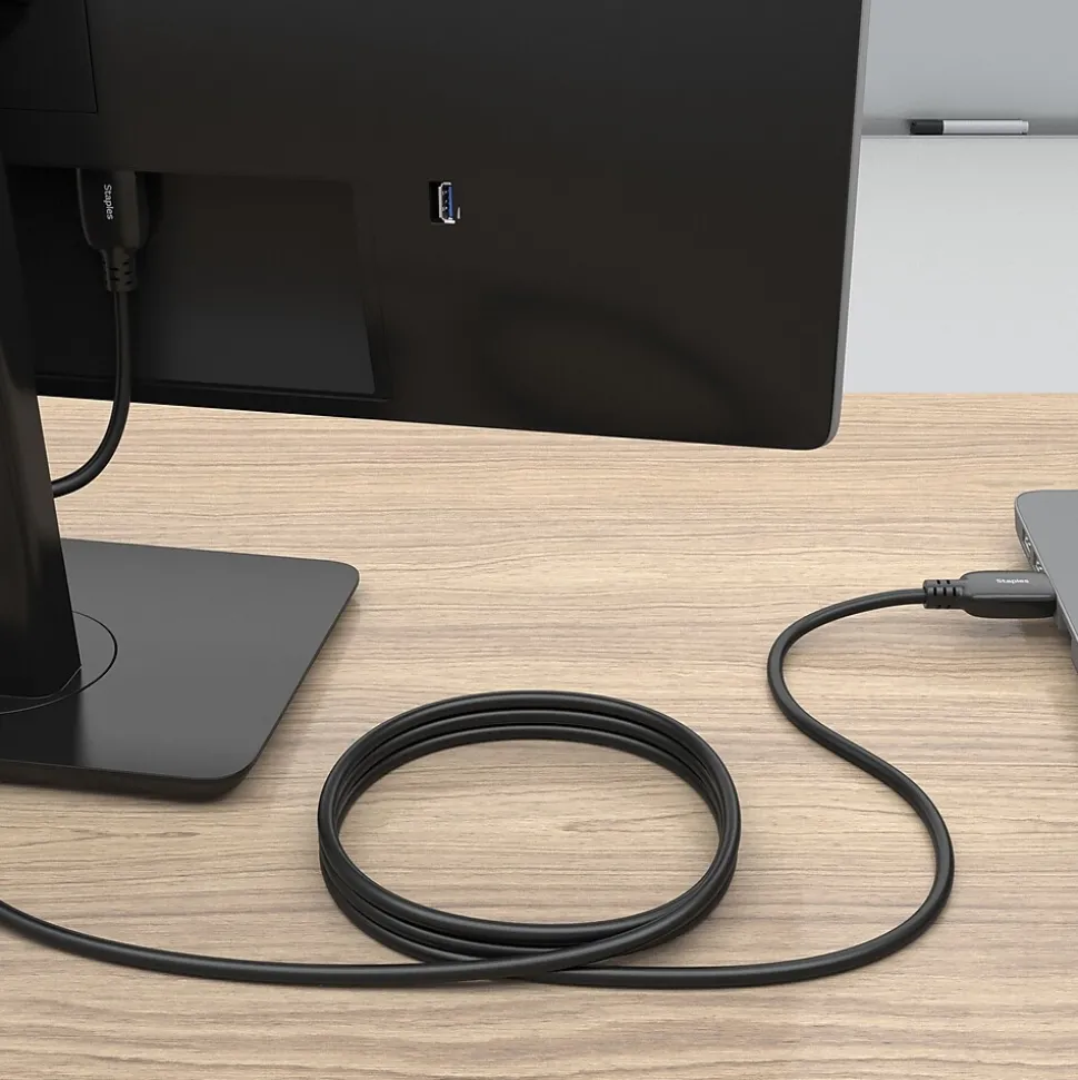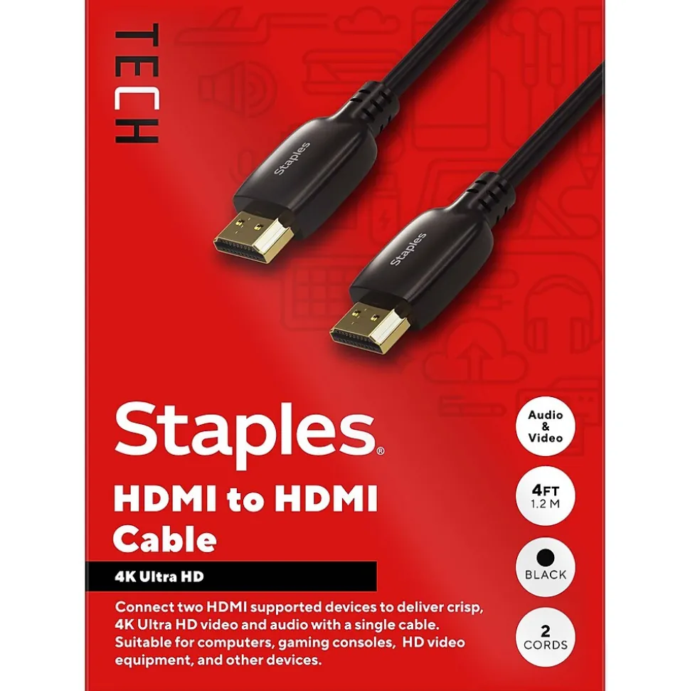 Delivering crisp 4K Ultra HD resolution this HDMI cable promises clear audio and video for an exceptional experience. Featuring a compact 4-foot cord, this cable will reduce cord clutter while giving you ample length to connect devices across your work or entertainment station. This cord is the perfect choice for outfitting your work, gaming or media space. Enjoy high resolution audio and video between devices so you can upgrade your home or office workspace and do your best work. Pack of two. Backed by Staples Brands 100% satisfaction guarantee, or your money back.