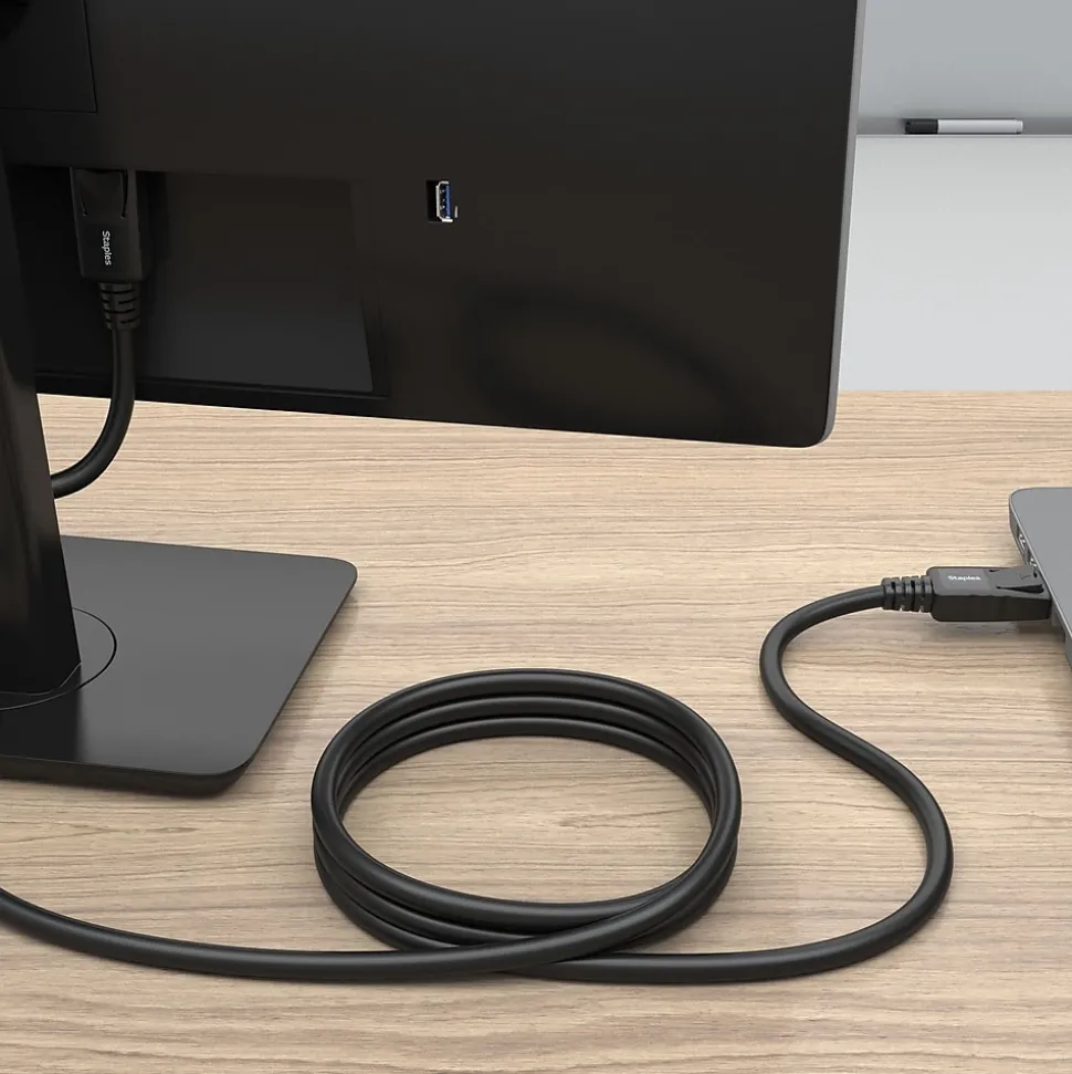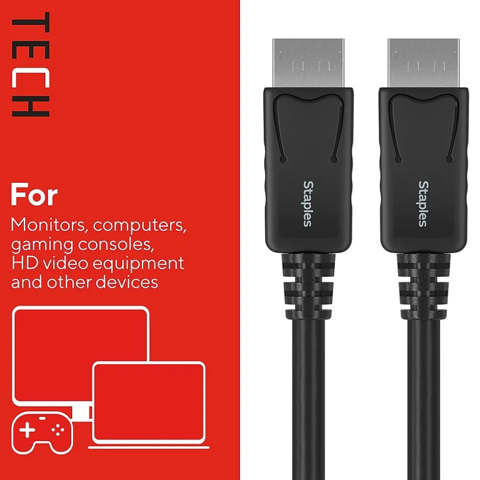 For work or entertainment an extra display often comes in handy. With the Staples TECH DisplayPort cable, you can connect additional monitors, displays, gaming consoles, projectors and more. Delivering crisp 4K Ultra HD resolution this cable promises clear audio and video for an exceptional experience. The compact 6-foot cord, provides ample length to connect devices across your work space while also reducing cord clutter. This cable is the perfect choice for outfitting your work, gaming or entertainment space. Enjoy high resolution audio and video so you can upgrade your home or office workspace and do your best work. Backed by Staples Brands 100% satisfaction guarantee, or your money back.