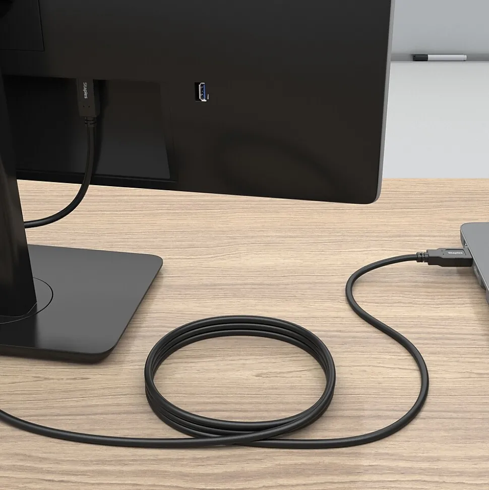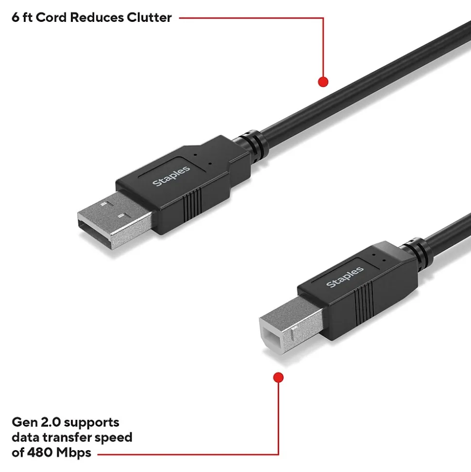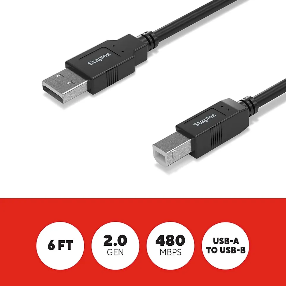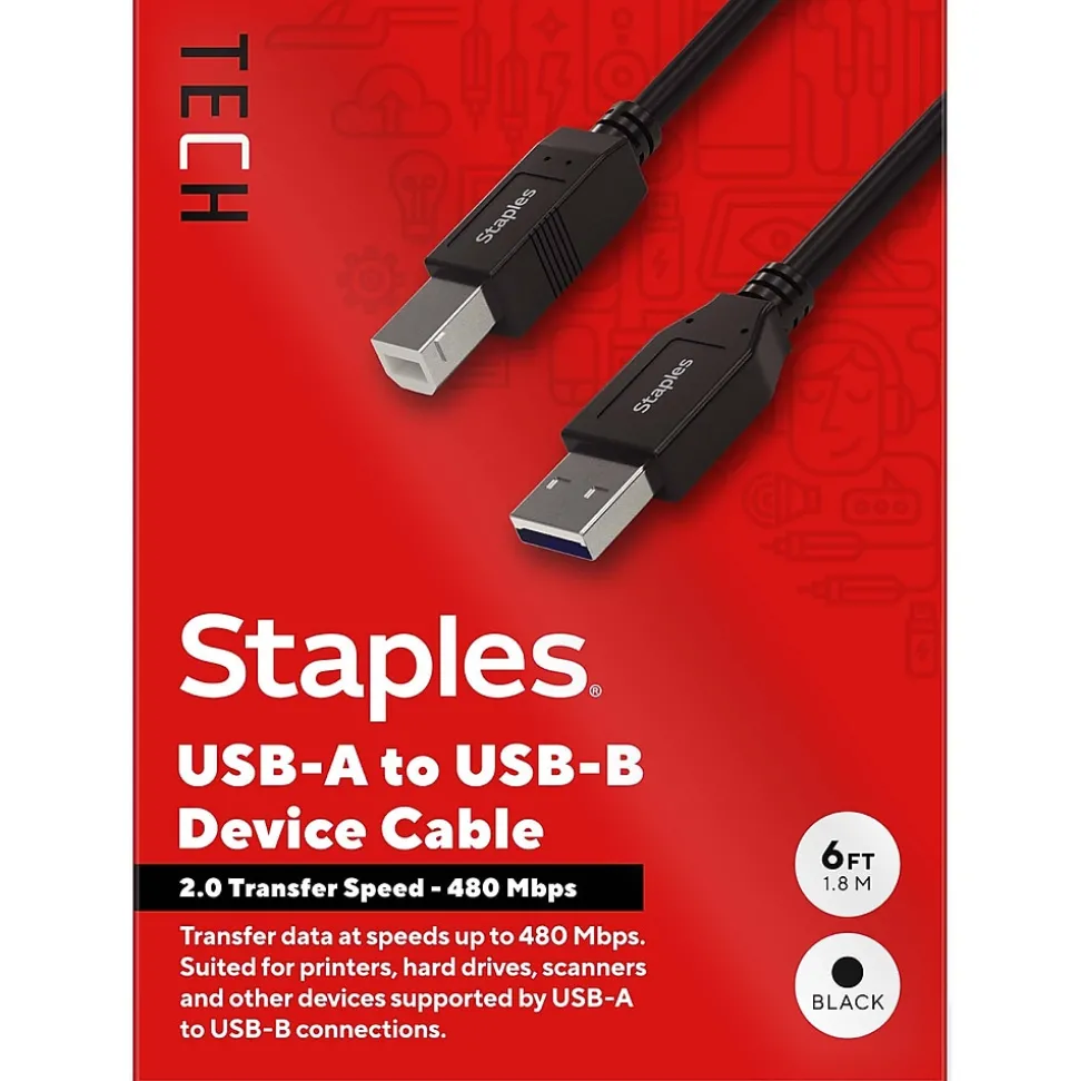 Connect peripheral devices like printers, copiers, external drivers and more with the Staples TECH USB-A to USB-B cable. The 6-foot cable is compact to reduce cord clutter, and the USB 2.0 boasts fast data transfer speeds up to 480 Mbps. Keep your workday running smoothly with the Staples TECH USB-A to USB-B cable. Backed by Staples Brands 100% satisfaction guarantee, or your money back.