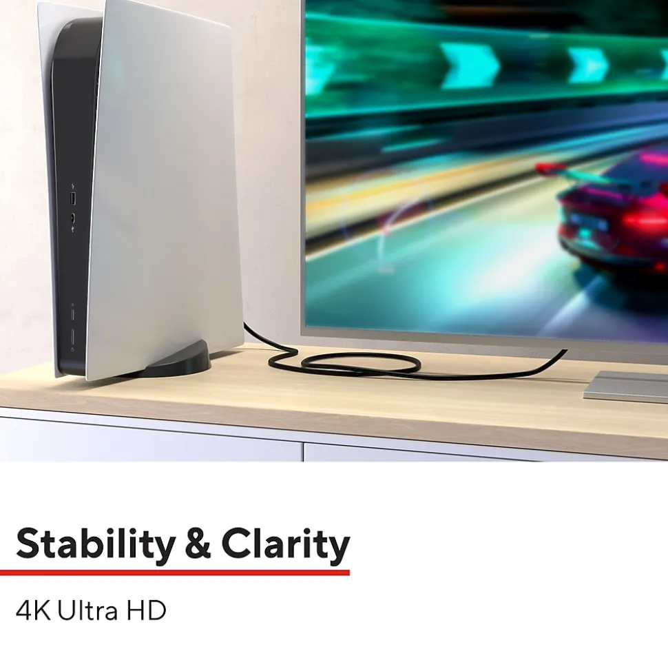 Delivering crisp 4K Ultra HD resolution this HDMI cable promises clear audio and video for an exceptional experience. Featuring a 8-foot cord, this cable provides you ample length to connect devices across your work or entertainment station. This cord is the perfect choice for outfitting your work, gaming or media space. Enjoy high resolution audio and video between devices so you can upgrade your home or office workspace and do your best work. Backed by Staples Brands 100% satisfaction guarantee, or your money back.