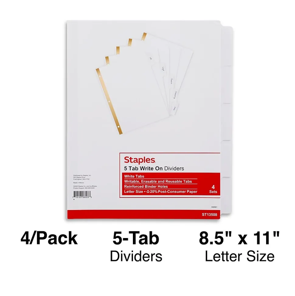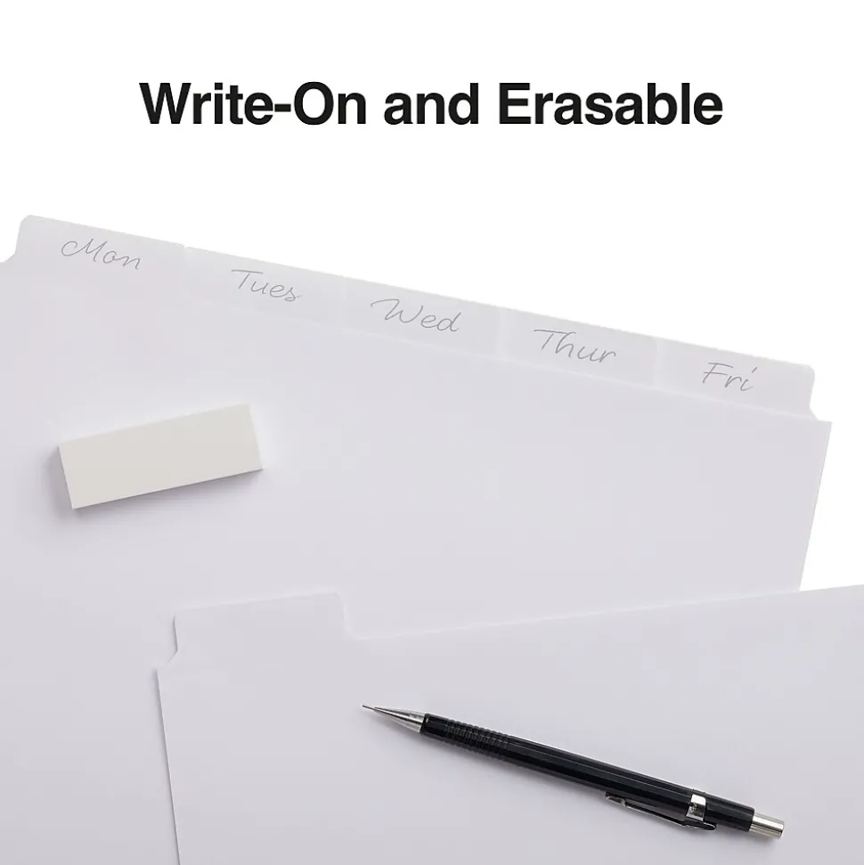 Keep pages in office binders organized with these Staples Write-On Large Tab dividers. The oversized tabs provide ample room for client names, account numbers or other identifying information, and the laminated finish means you can reuse these dividers. Reinforced edges prevent rips and tears from frequent page turns. With an assorted tab layout, these Staples Write-On Large Tab dividers make each label easy to read.